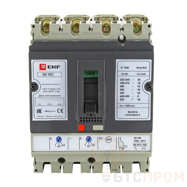 Выключатель ВА-99С выполнен в виде моноблока и состоит из основания и крышки с фальш-панелью, в которой имеется окно для рукоятки управления и толкатель кнопки «Тест» – для проверки механизма отключения выключателя.Основание выполнено из термостойкой пластмассы, не поддерживающей горение и являющейся несущей конструкцией для присоединительных зажимов, блок ротоактивных контактов с двумя дугогасительными камерами представляет собой жесткую сборку в отдельном корпусе, механизма управления, блока защиты от сверхтоков и перегрузки (расцепителя). Крышка закрывает все подвижные элементы механизма управления и внутренние токоведущие части.