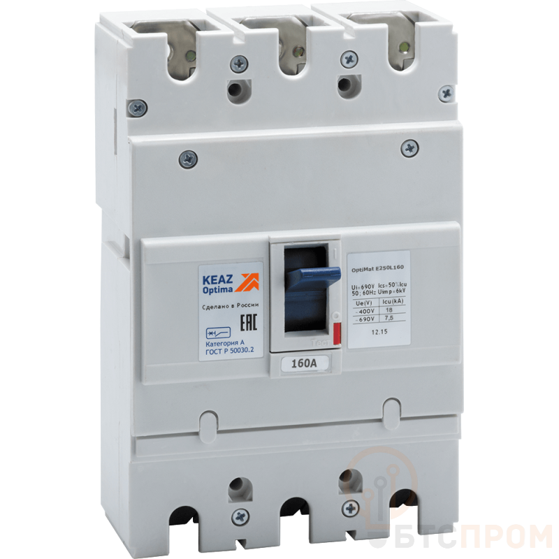 Силовой 3 полюсный автоматический выключатель переменного тока в литом корпусе на номинальный ток 160 А.