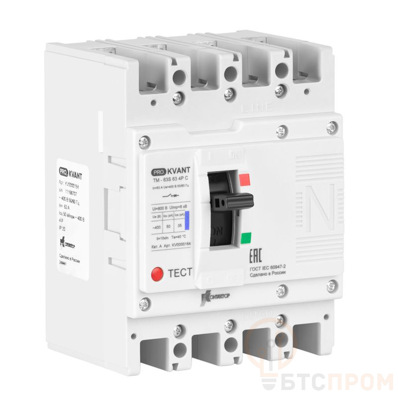 Выключатель автоматический PRO.KVANT TM-63S 4P C 63А 50кА в литом корпусе с термомагнит. расцеп. Контактор KV0000164