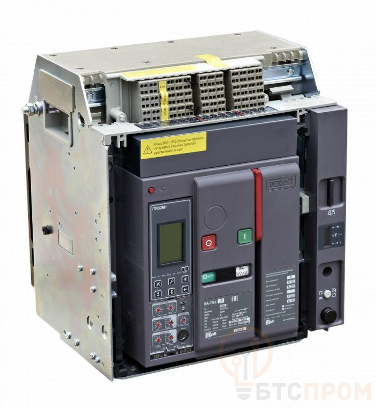 Воздушный автоматический выключатель серии ВА-751 Dekraft; 3P; номинальный ток 400 А; отключающая способность 50 кА, стационарный, блок управления типа H; присоединения задние горизонтальные. В базовую комплектацию входят моторный привод (230 В пер.тока), 4 контакта состояния ВКЛ/ОТКЛ, сигнальный контакт, электромагнит включения (230 В пер.тока), независимый расцепитель (230 В пер.тока), сигнальный контакт положения аппарата в корзине, разделители полюсов и рамка передней панели. Выключатели с блоком управления типа H позволяют осуществлять мониторинг и диспетчеризацию защищаемой сети и нагрузок.