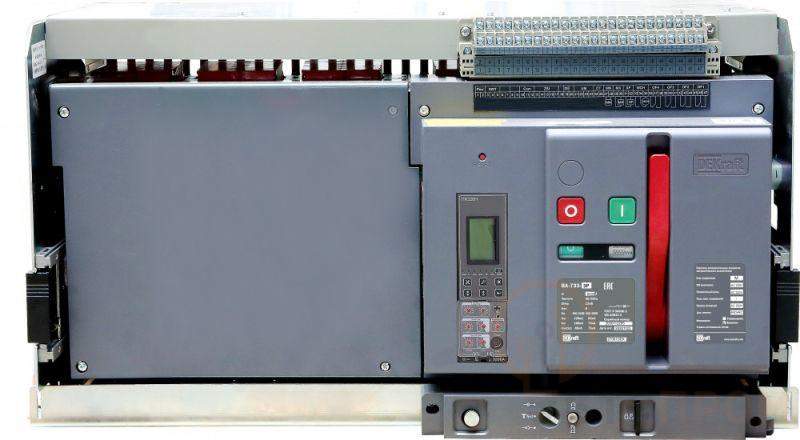 Воздушный автоматический выключатель серии ВА-733 Dekraft; 3P; номинальный ток 6300 А; отключающая способность 120 кА, выкатной, блок управления типа H; присоединения задние горизонтальные. В базовую комплектацию входят моторный привод (230 В пер.тока), 4 контакта состояния ВКЛ/ОТКЛ, сигнальный контакт, электромагнит включения (230 В пер.тока), независимый расцепитель (230 В пер.тока), сигнальный контакт положения аппарата в корзине, разделители полюсов и рамка передней панели. Выключатели с блоком управления типа H позволяют осуществлять мониторинг и диспетчеризацию защищаемой сети и нагрузок.