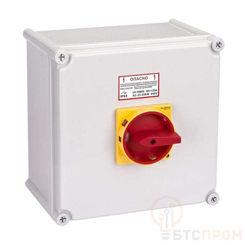 Выключатель-разъединитель MSD в корпусе IP65 на номинальный ток 125 А. Может использоваться в качестве главного аварийного выключателя. Применяется для коммутации силовых электрических цепей активной, индуктивной или смешанной нагрузок, может использоваться для включения и отключения двигателей категорий применения AC–3 и DC–3. 4-полюсное исполнение, красная поворотная рукоятка с возможностью блокировки навесными замками.