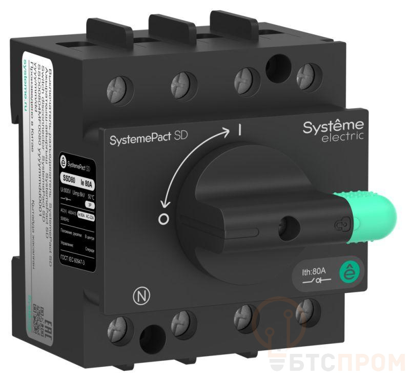 Выключатель-разъединитель серии SystemePact SD80 на номинальный ток 20А, 4Р. Предназначен для применения в сетях низкого напряжения переменного тока. Аппарат применяется для неавтоматического замыкания и размыкания электрических цепей. Монтаж устройства осуществляется на DIN-рейку. Возможна установка дополнительных контактов