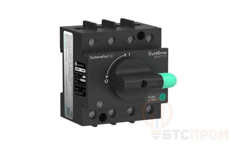 Выключатель-разъединитель серии SystemePact SD80 на номинальный ток 32А, 4Р. Предназначен для применения в сетях низкого напряжения переменного тока. Аппарат применяется для неавтоматического замыкания и размыкания электрических цепей. Монтаж устройства осуществляется на DIN-рейку. Возможна установка дополнительных контактов