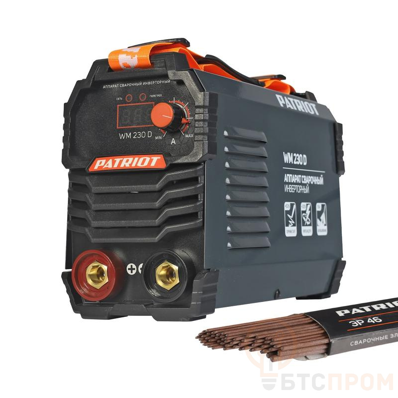 Сварочный инверторный аппарат PATRIOT WM230D для ручной дуговой сварки электродом (ММА).Аппарат прост в управлении, устойчив к механическим воздействиям, перепадам температур, влажности, пыли, атмосферным осадкам.Подходит для работы при неустойчивой сети питания, включая электрогенераторные установки.