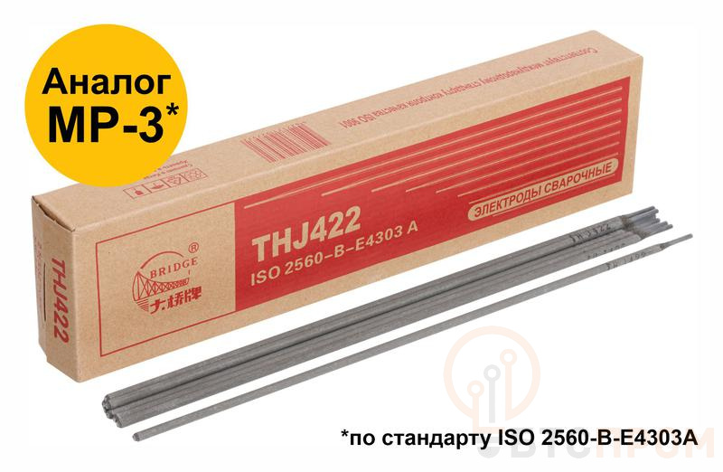 BRIDGE THJ422 - сварочный электрод с рутиловым покрытием. Подходит как для переменного тока, так и для постоянного. Предназначен для ручной дуговой сварки конструкций из низкоуглеродистых конструкционных сталей с классом прочности Q235. Сварка позиций: PA, PB, PC, PD, PE, PF.