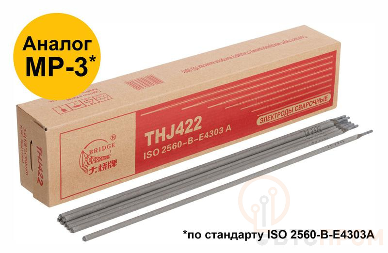 BRIDGE THJ422 - сварочный электрод с рутиловым покрытием. Подходит как для переменного тока, так и для постоянного. Предназначен для ручной дуговой сварки конструкций из низкоуглеродистых конструкционных сталей с классом прочности Q235. Сварка позиций: PA, PB, PC, PD, PE, PF.