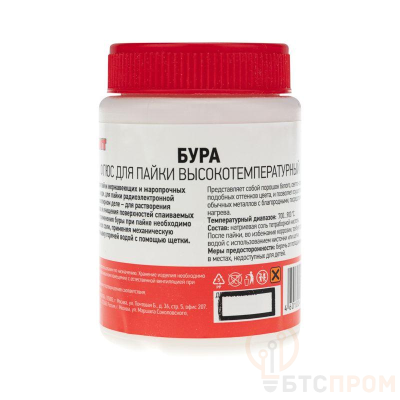 Флюс для пайки БУРА REXANT применяется для пайки нержавеющих и жаропрочных сталей, чугуна и меди. Также используется в ювелирном деле для растворения окислов металлов и очищения поверхностей спаиваемых деталей, а также при пайке ювелирных украшений из золота, серебра, мельхиора. Представляет собой порошок, который может иметь оттенки белого или светло-серого цветов. После пайки необходимо промыть рабочую поверхность горячей водой, используя кисточку или щетку для того, чтобы удалить оставшиеся соли и избежать появления коррозии. После перехода в текучее состояние кристаллизуется с выделением специфических веществ, которые очищают кромки соединяемых деталей от грязи, пыли, следов масла. Температура пайки: +700...+900 °C. Температура наибольшей активности: +800...+1150 °C. Вариант фасовки – банка с крышкой, вес нетто 100 г. Состав: натриевая соль тетраборной кислоты.