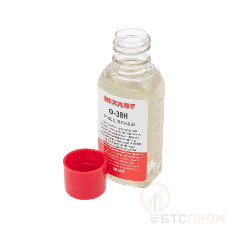 Флюс Ф-38Н REXANT предназначен для удаления оксидов с поверхности под пайку, улучшения растекания жидкого припоя и защиты от окисления нихрома, константана, манганина, бериллиевой и алюминиевой бронз, коррозионностойких сталей от воздействия окружающей среды. Изготовлен в соответствии с ОСТ 4Г 0.033.200. Может наноситься на паяемые элементы без предварительной зачистки. Является высокоактивным флюсом и при длительном контакте может вызвать коррозию места пайки, поэтому требует обязательной смывки после работы. Легко удаляется смоченной в воде или спиртовом растворе тканью или кисточкой. Для уменьшения активности в некоторых случаях флюс в равном количестве разбавляют этиловым или изопропиловым спиртом. Температура наибольшей активности: +300...+350°С. Состав: ортофосфорная кислота, глицерин, этиленгликоль и диэтиламин солянокислый. Вариант фасовки – флакон объемом 30 мл.