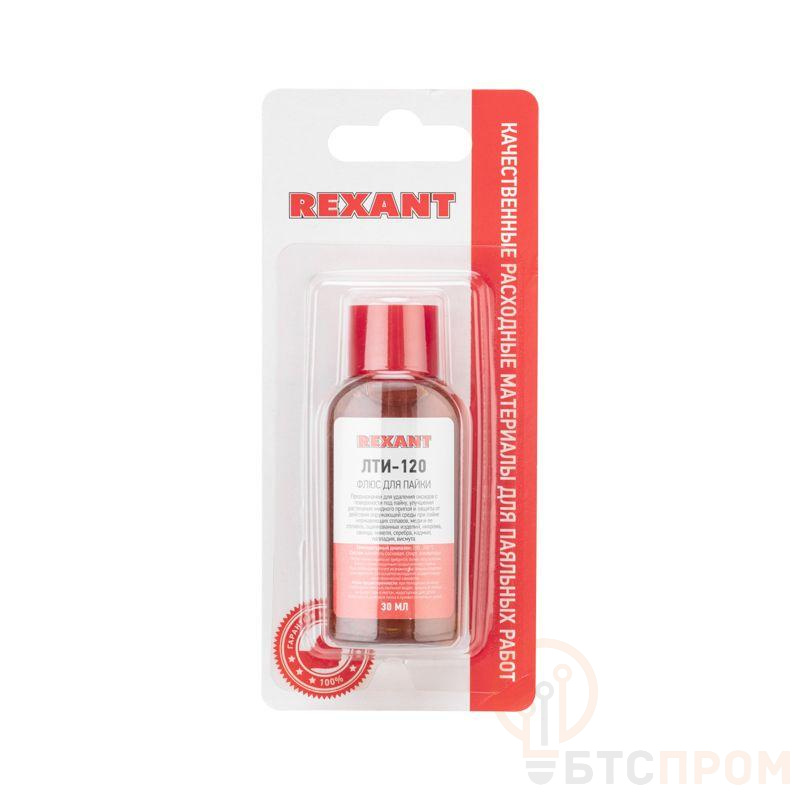 Флюс ЛТИ-120 REXANT предназначен для удаления оксидов с поверхности под пайку, улучшения растекания жидкого припоя и защиты нержавеющих сплавов, меди и ее сплавов, оцинкованных изделий, нихрома, свинца, никеля, серебра, кадмия, палладия, висмута от воздействия окружающей среды. Изготовлен в соответствии с ТУ 84-406-73. Данный низкотемпературный флюс применяется при пайке и лужении деталей в радиоэлектронике. После пайки смывка не требуется: остатки флюса послужат защитным покрытием мест пайки. При необходимости растворяется спиртом или ацетоном. Преимущества: не проводит ток, поэтому широко применяется при пайке печатных плат и радиоаппаратуры; не требует отмывки после пайки; повышает прочность соединений. Температура наибольшей активности: +200...+300°С. Состав: канифоль сосновая, связующая жидкость, триэтаноламин, диэтиламин гидрохлорид. Вариант фасовки – флакон 30 мл.