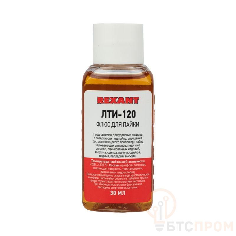 Флюс ЛТИ-120 REXANT предназначен для удаления оксидов с поверхности под пайку, улучшения растекания жидкого припоя и защиты нержавеющих сплавов, меди и ее сплавов, оцинкованных изделий, нихрома, свинца, никеля, серебра, кадмия, палладия, висмута от воздействия окружающей среды. Изготовлен в соответствии с ТУ 84-406-73. Данный низкотемпературный флюс применяется при пайке и лужении деталей в радиоэлектронике. После пайки смывка не требуется: остатки флюса послужат защитным покрытием мест пайки. При необходимости растворяется спиртом или ацетоном. Преимущества: не проводит ток, поэтому широко применяется при пайке печатных плат и радиоаппаратуры; не требует отмывки после пайки; повышает прочность соединений. Температура наибольшей активности: +200...+300°С. Состав: канифоль сосновая, связующая жидкость, триэтаноламин, диэтиламин гидрохлорид. Вариант фасовки – флакон 30 мл.