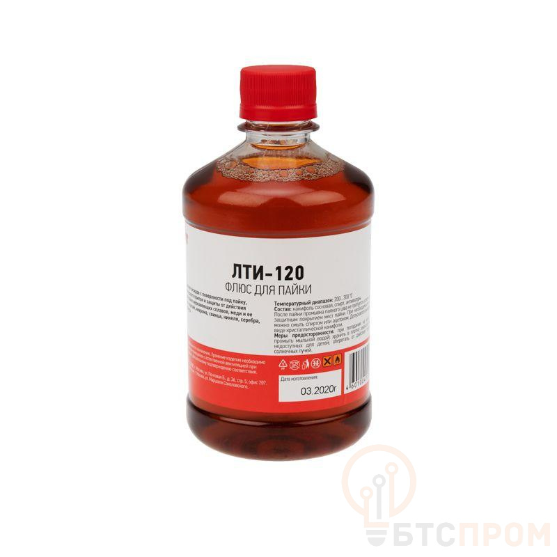 Флюс ЛТИ-120 REXANT предназначен для удаления оксидов с поверхности под пайку, улучшения растекания жидкого припоя и защиты нержавеющих сплавов, меди и ее сплавов, оцинкованных изделий, нихрома, свинца, никеля, серебра, кадмия, палладия, висмута от воздействия окружающей среды. Изготовлен в соответствии с ТУ 84-406-73. Данный низкотемпературный флюс применяется при пайке и лужении деталей в радиоэлектронике. После пайки смывка не требуется: остатки флюса послужат защитным покрытием мест пайки. При необходимости растворяется спиртом или ацетоном. Преимущества: не проводит ток, поэтому широко применяется при пайке печатных плат и радиоаппаратуры; не требует отмывки после пайки; повышает прочность соединений. Температура наибольшей активности: +200...+300°С. Состав: канифоль сосновая, связующая жидкость, триэтаноламин, диэтиламин гидрохлорид. Вариант фасовки – флакон 500 мл.