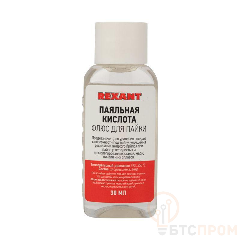 Паяльная кислота REXANT является одним из самых распространенных флюсов для пайки. Предназначена для удаления оксидов с поверхности под пайку и улучшения растекания жидкого припоя при пайке углеродистых и низколегированных сталей, меди, никеля и их сплавов. Применяется при пайке и лужении деталей припоями оловянно-свинцовой. Изготовлена в соответствии с ОСТ 4Г 0.033.200. Температура наибольшей активности: +290...+350°С. После пайки рекомендуется смыть остатки кислоты 5% раствором кальцинированной соды. Высокая проникаемость флюса позволяет легко обработать контакт в самых труднодоступных местах, а агрессивность способствует быстрому разрушению оксидной пленки на поверхности металла. Основные компоненты: хлорид цинка и вода. Вариант фасовки – флакон объемом 30 мл.