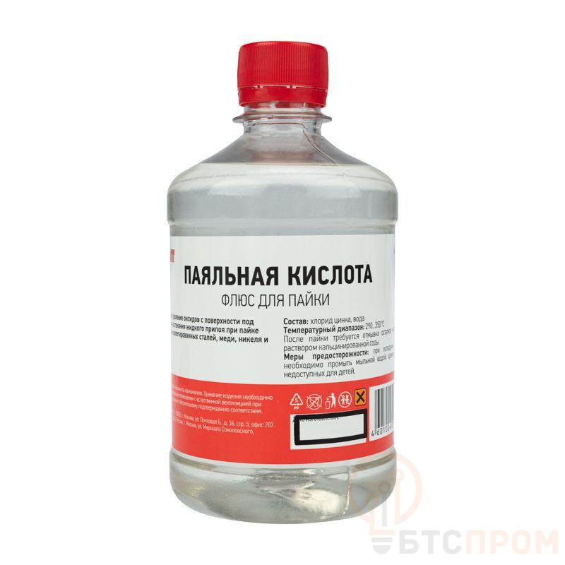 Паяльная кислота REXANT является одним из самых распространенных флюсов для пайки. Предназначена для удаления оксидов с поверхности под пайку и улучшения растекания жидкого припоя при пайке углеродистых и низколегированных сталей, меди, никеля и их сплавов. Применяется при пайке и лужении деталей припоями оловянно-свинцовой. Изготовлена в соответствии с ОСТ 4Г 0.033.200. Температура наибольшей активности: +290...+350°С. После пайки рекомендуется смыть остатки кислоты 5% раствором кальцинированной соды. Высокая проникаемость флюса позволяет легко обработать контакт в самых труднодоступных местах, а агрессивность способствует быстрому разрушению оксидной пленки на поверхности металла. Основные компоненты: хлорид цинка и вода. Вариант фасовки – флакон объемом 500 мл.