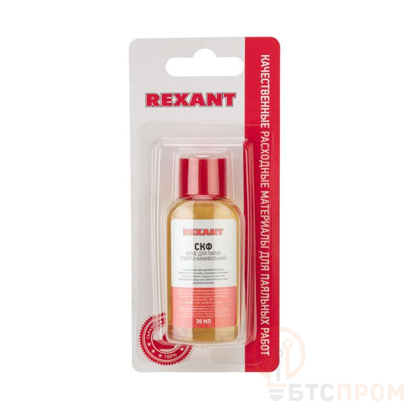 Флюс СКФ (спирто-канифольный) REXANT предназначен для удаления оксидов с поверхности под пайку, улучшения растекания жидкого припоя и защиты от действия окружающей среды при пайке печатных плат и радиокомпонентов. Наиболее эффективен при работе с медью и ее сплавами. Изготовлен в соответствии с ОСТ 4Г 0.033.200. Часто используется для ремонта радиоаппаратуры. Температура наибольшей активности: +250...+280°С. Данный флюс является нейтральным, то есть не вызывает разрушение металла, поэтому по окончании пайки смывка не требуется. В процессе хранения при низких температурах допускается образование осадка, не влияющего на качество флюса. Основные компоненты: связующая жидкость и канифоль. Вариант фасовки – флакон объемом 30 мл.