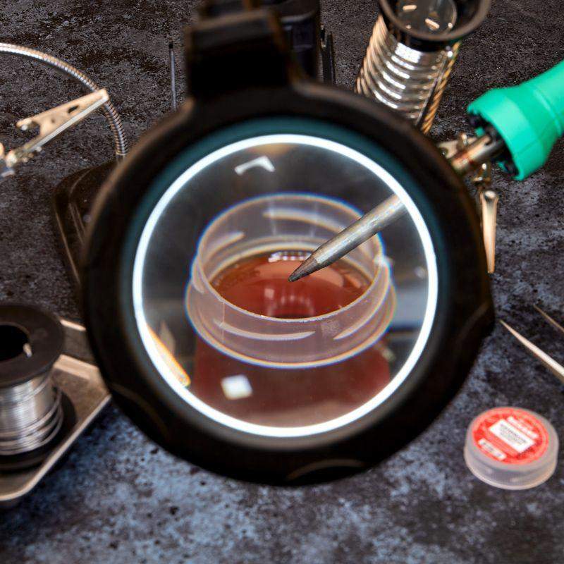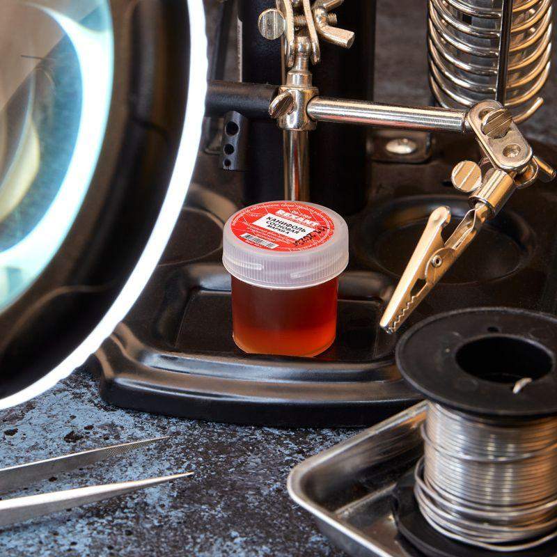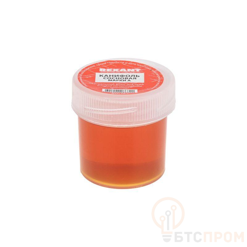 Канифоль сосновая марки А REXANT предназначена для удаления тонких и нестойких оксидов с поверхности под пайку, улучшения растекания жидкого припоя при пайке печатных плат и радиокомпонентов. Изготовлена в соответствии с ГОСТ 19113-84. Канифоль представляет собой хрупкое стекловидное вещество от темно-красного до светло-желтого цвета, применяемое в качестве нейтрального флюса при пайке и лужении деталей и поверхностей оловянно-свинцовыми припоями. Изготовляется из смол хвойных деревьев. После пайки смывка не требуется. Обладает следующими преимуществами: повышает прочность соединений; не образует вредных испарений при нагреве; не ухудшает электропроводимость места пайки; применяется при соединении легкоплавких контактов. Температура наибольшей активности: +170...+250°C. Вариант фасовки – банка с крышкой, вес нетто 10 г. При использовании необходимо соблюдать меры предосторожности.