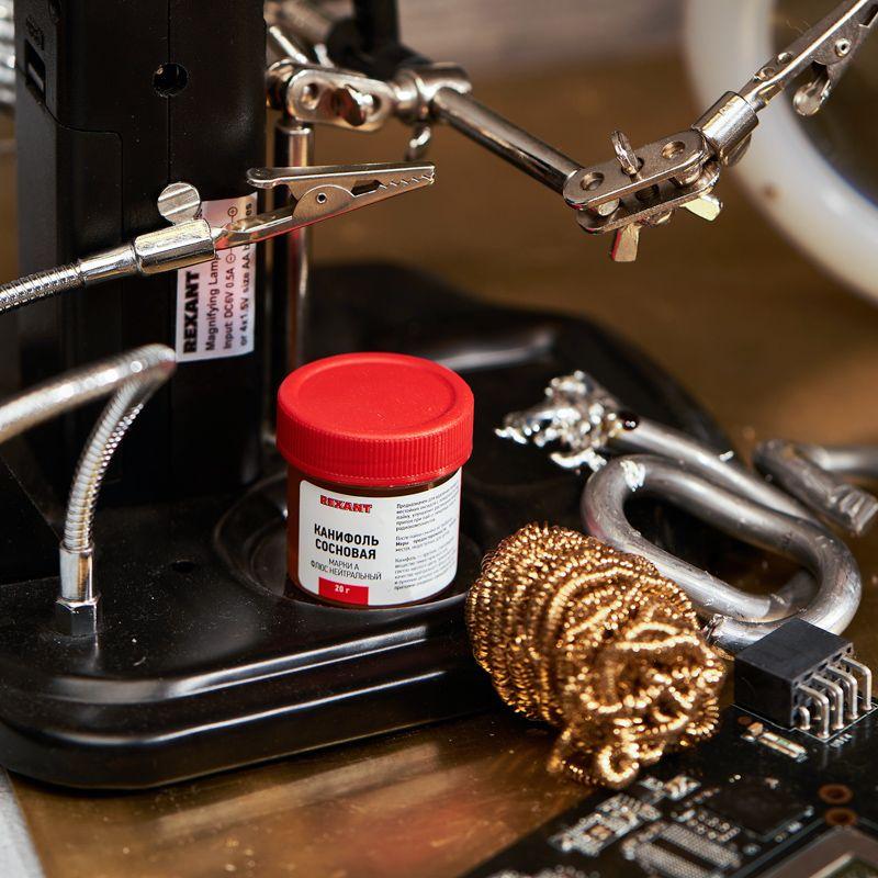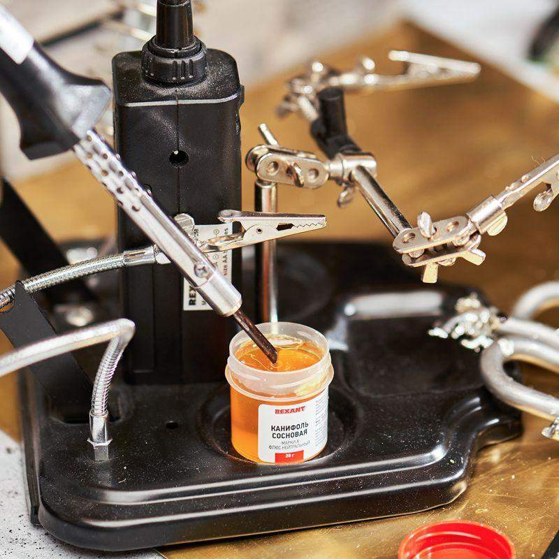 Канифоль сосновая марки А REXANT предназначена для удаления тонких и нестойких оксидов с поверхности под пайку, улучшения растекания жидкого припоя при пайке печатных плат и радиокомпонентов. Изготовлена в соответствии с ГОСТ 19113-84. Канифоль представляет собой хрупкое стекловидное вещество от темно-красного до светло-желтого цвета, применяемое в качестве нейтрального флюса при пайке и лужении деталей и поверхностей оловянно-свинцовыми припоями. Изготовляется из смол хвойных деревьев. После пайки смывка не требуется. Обладает следующими преимуществами: повышает прочность соединений; не образует вредных испарений при нагреве; не ухудшает электропроводимость места пайки; применяется при соединении легкоплавких контактов. Температура наибольшей активности: +170...+250°C. Вариант фасовки – банка с крышкой, вес нетто 20 г. При использовании необходимо соблюдать меры предосторожности.