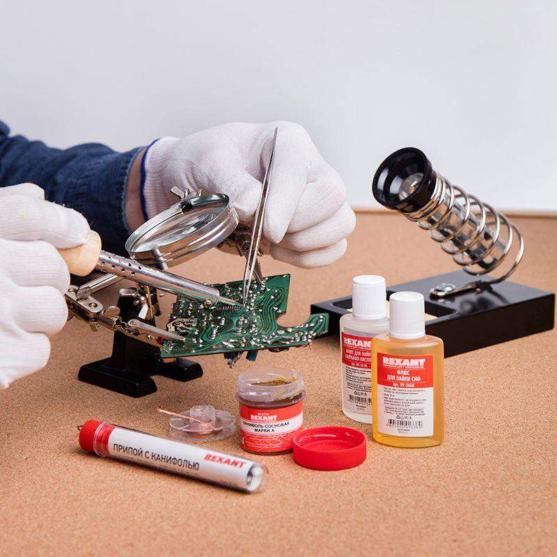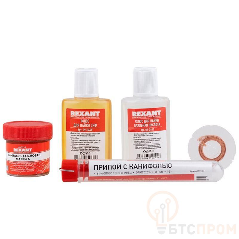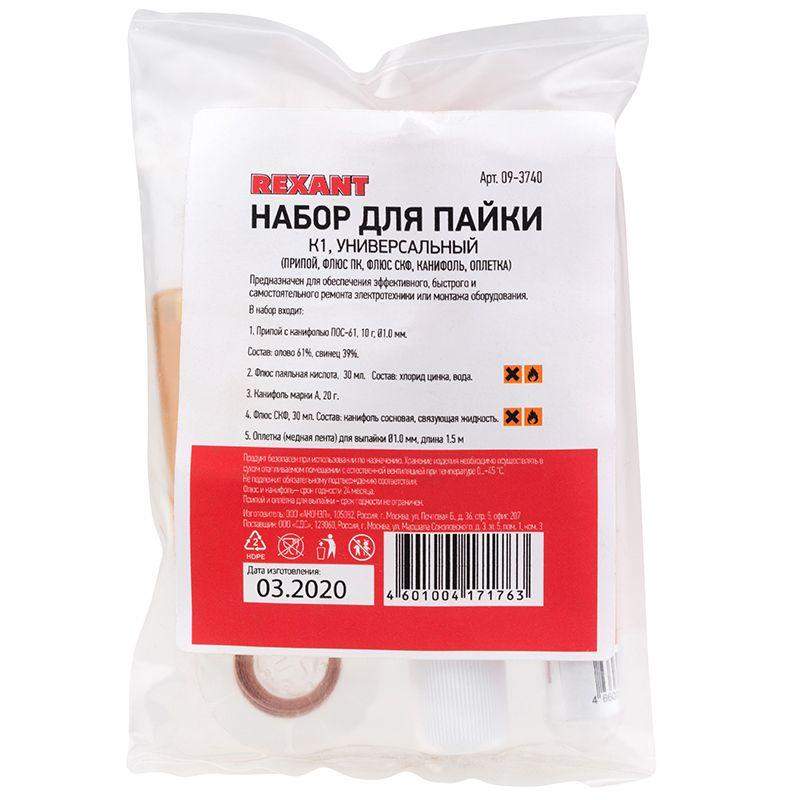 Набор для пайки K1 содержит самые необходимые расходные материалы, используемые при пайке радиодеталей и печатных плат. Предназначен для ручной пайки при выполнении работ с паяльником. Все элементы, входящие в состав набора, позволяют обеспечить эффективный, быстрый и качественный ремонт электротехники или монтаж оборудования. В набор входят следующие 5 предметов: припой с канифолью ПОС-61 весом 10 г и диаметром 1 мм; флюс ПАЯЛЬНАЯ КИСЛОТА объемом 30 мл; флюс СКФ объемом 30 мл; канифоль марки А весом 20 г; оплетка (медная лента) для выпайки длиной 1,5 м.