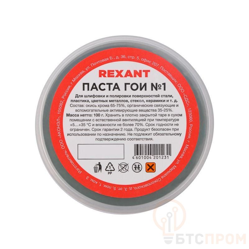 Паста ГОИ № 1 (аббревиатура от Государственный Оптический Институт) – это абразивный материал, применяемый для шлифовки и полировки поверхностей стали, пластика, цветных металлов, стекол, керамики и т. д. Основными компонентами являются оксид хрома, различные связующие и другие дополнительные компоненты. Широкое применение паста ГОИ получила благодаря простоте применения, возможности в домашних условиях производить шлифовку и полировку поверхностей. Подбор полировальной пасты: ВНИМАНИЕ! Важно правильно подобрать пасту с соответствующим уровнем абразивности. Использование по ошибке крупных частиц и (или) чрезмерного усилия, может привести к повреждению поверхности. В зависимости от абразивных качеств паста подразделяется на следующие типы: ПАСТА № 1 («тонкая» или «финишная»). Имеет почти черный цвет с зеленоватым отливом и абразивность 0.3-0.1 мкм. Содержание оксида хрома от 65 до 75%. Применяется для чистовой, зеркальной полировки. ПАСТА № 2 («тонкая»). Материал темно-зеленого цвета, имеющий абразивность 7.0-1.0 мкм. Содержание оксида хрома от 65 до 77%. Применяется для тонкой доводки поверхности с приданием зеркального блеска. ПАСТА № 3 («средняя»). Имеет зеленый цвет и абразивность 17.0-8.0 мкм. Содержание оксида хрома от 70 до 80%. Применяется для создания чистой поверхности и получения равномерного блеска. ПАСТА № 4 («грубая»). Материал светло-зеленого цвета, имеющий абразивность 40.0-18.0 мкм. Содержание абразива от 75 до 85%. Используется для получения матовой поверхности и удаления мелких царапин. Технические характеристики: Внешний вид: твердая масса зеленого цвета Состав: окись хрома 65-75%, органические связующие и вспомогательные активирующие вещества 35-25% Масса нетто: 100 г РЕКОМЕНДУЕМЫЙ ПОРЯДОК РАБОТ 1. Нанести небольшое количество пасты на полировальный круг, фланелевую ветошь, либо другой аналогичный мягкий материал. Не следует наносить пасту непосредственно на обрабатываемую поверхность. 2. В некоторых случаях, для растворения пасты, допустимо предварительно смочить круг или ветошь керосином или бензином. 3. Для равномерного распределения, разотрите нанесенную на ветошь или круг пасту о металл. Это необходимо для удаления крупных кусков абразивного материала способного повредить поверхность. 4. Добавьте небольшое количество индустриального масла на обрабатываемую поверхность. 5. Можно начинать полировку, периодически добавляя пасту. В процессе работы не следует делать резких движений или прикладывать большие усилия, это может привести к появлению царапин. Производите полировку до получения необходимого блеска. 6. После завершения промойте поверхность керосином или, удалите остатки абразива водой. МЕРЫ ПРЕДОСТОРОЖНОСТИ Хранить в местах, недоступных для детей. Паста REXANT соответствует ТУ 6-18-36-85.