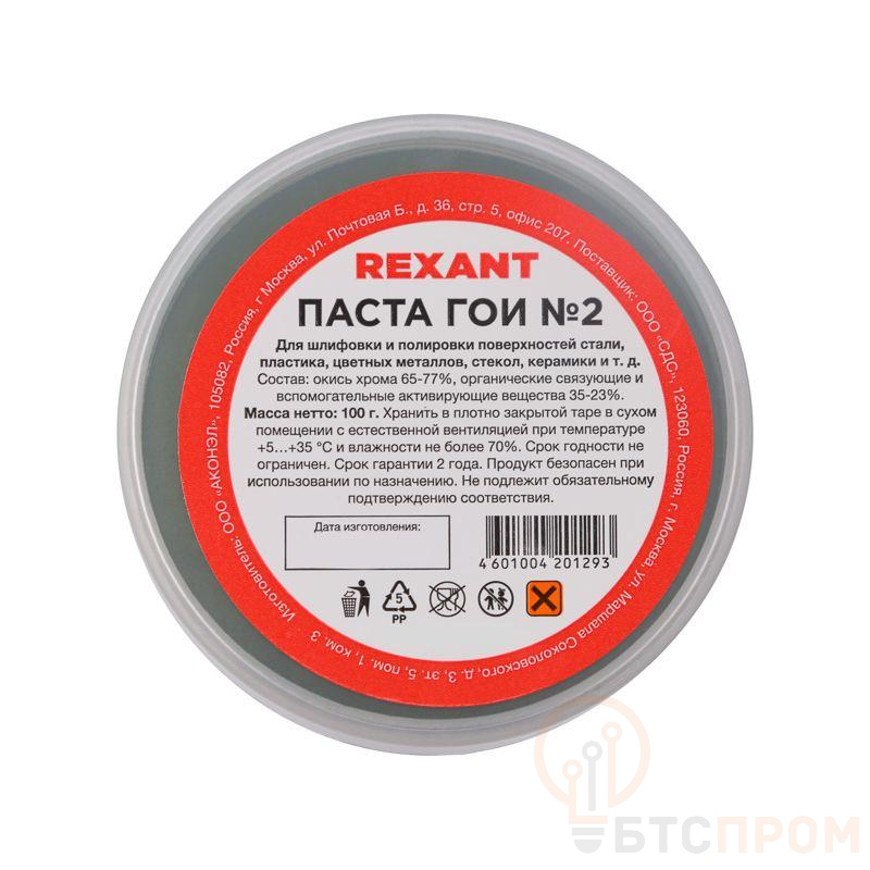 Паста ГОИ № 2 (аббревиатура от Государственный Оптический Институт) – это абразивный материал, применяемый для шлифовки и полировки поверхностей стали, пластика, цветных металлов, стекол, керамики и т. д. Основными компонентами являются оксид хрома, различные связующие и другие дополнительные компоненты. Широкое применение паста ГОИ получила благодаря простоте применения, возможности в домашних условиях производить шлифовку и полировку поверхностей. Подбор полировальной пасты: ВНИМАНИЕ! Важно правильно подобрать пасту с соответствующим уровнем абразивности. Использование по ошибке крупных частиц и (или) чрезмерного усилия, может привести к повреждению поверхности. В зависимости от абразивных качеств паста подразделяется на следующие типы: ПАСТА № 1 («тонкая» или «финишная»). Имеет почти черный цвет с зеленоватым отливом и абразивность 0.3-0.1 мкм. Содержание оксида хрома от 65 до 75%. Применяется для чистовой, зеркальной полировки. ПАСТА № 2 («тонкая»). Материал темно-зеленого цвета, имеющий абразивность 7.0-1.0 мкм. Содержание оксида хрома от 65 до 77%. Применяется для тонкой доводки поверхности с приданием зеркального блеска. ПАСТА № 3 («средняя»). Имеет зеленый цвет и абразивность 17.0-8.0 мкм. Содержание оксида хрома от 70 до 80%. Применяется для создания чистой поверхности и получения равномерного блеска. ПАСТА № 4 («грубая»). Материал светло-зеленого цвета, имеющий абразивность 40.0-18.0 мкм. Содержание абразива от 75 до 85%. Используется для получения матовой поверхности и удаления мелких царапин. Технические характеристики: Внешний вид: твердая масса зеленого цвета Состав: окись хрома 65-77%, органические связующие и вспомогательные активирующие вещества 35-23% Масса нетто: 100 г РЕКОМЕНДУЕМЫЙ ПОРЯДОК РАБОТ 1. Нанести небольшое количество пасты на полировальный круг, фланелевую ветошь, либо другой аналогичный мягкий материал. Не следует наносить пасту непосредственно на обрабатываемую поверхность. 2. В некоторых случаях, для растворения пасты, допустимо предварительно смочить круг или ветошь керосином или бензином. 3. Для равномерного распределения, разотрите нанесенную на ветошь или круг пасту о металл. Это необходимо для удаления крупных кусков абразивного материала, способного повредить поверхность. 4. Добавьте небольшое количество индустриального масла на обрабатываемую поверхность. 5. Можно начинать полировку, периодически добавляя пасту. В процессе работы не следует делать резких движений или прикладывать большие усилия, это может привести к появлению царапин. Производите полировку до получения необходимого блеска. 6. После завершения промойте поверхность керосином или удалите остатки абразива водой. МЕРЫ ПРЕДОСТОРОЖНОСТИ Хранить в местах, недоступных для детей. Паста REXANT соответствует ТУ 6-18-36-85.