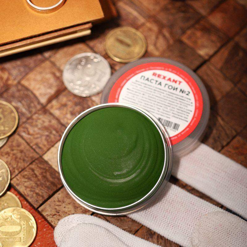 Паста полировальная ГОИ 30 г REXANT предназначена для шлифования и полирования стальных сплавов, цветных металлов, твёрдых пластмасс и полимеров, стекла (в том числе оптического), керамических материалов и изделий из них, тем самым устраняя мелкие царапины и добиваясь ровного блеска полируемой поверхности. Паста ГОИ (аббревиатура учреждения, в котором была разработана — Государственный Оптический Институт) состоит из оксида хрома (придаёт зелёный цвет) в виде абразивного порошка, жировых органических связующих, а также вспомогательных веществ, которые делают добавки более активными и интенсивными. Представляет собой брусок зелёного цвета (непохожего на пасту), который наносят либо, прикладывая брусок к вращающемуся полировальному кругу, либо, если вы полируете вручную, натирают ею полировальную ткань. Характеристики: Состав: Окись хрома 74,8%, Силикагель 1,0%, Стеарин 10,0%, Расщепленный жир 10,0%, Керосин 2,0%, Олеиновая кислота 2,0%, Сода двууглекислая 0,2 Масса нетто: 30 г Меры предосторожности: хранить в местах, недоступных для детей.