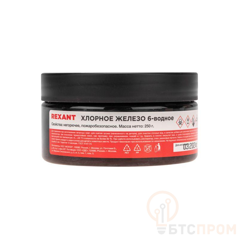 6-ти водное хлорное железо REXANT находит широкое применение во многих отраслях. В промышленности используется для изготовления печатных плат, очистки сточных вод, а также для снятия хрома, нанесенного на детали. В строительстве применяется в качестве добавки для увеличения прочности бетона, в качестве катализатора, при получении термостойких смол и в качестве протравки при окрашивании тканей, при закреплении красителей разного типа и т.д. 6-ти водное хлорное железо уже смешанно с водой, поэтому не требует времени на разбавление и уже готово к использованию, благодаря чему имеет более низкую цену и более безопасно. Имеет желто-бурый цвет. Негорючее, пожаробезопасное, с низкой токсичностью. Масса нетто: 250 г. Травление плат Время травления занимает от 40 до 50 минут, в зависимости от температуры, толщины медного слоя, концентрации раствора и его загрязнённости медью. Чем выше температура раствора, тем меньше время травления. Готовую плату нужно промыть проточной водой и высушить.