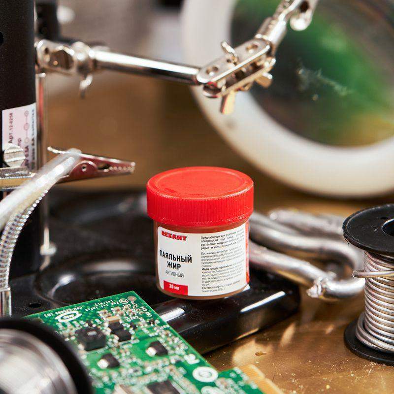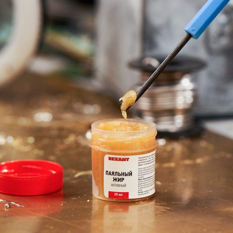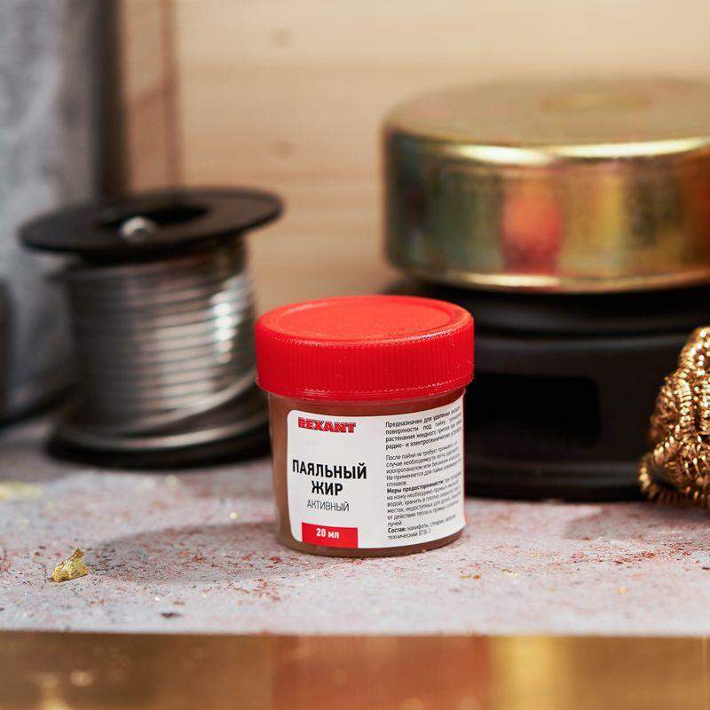 Активный паяльный жир предназначен для удаления оксидов с поверхности под пайку, улучшения растекания жидкого припоя при пайке сильно окисленных деталей, черных и цветных металлов, углеродистых сталей, меди и никеля. Используется для замены паяльной кислоты. Не применяется для пайки алюминия, его сплавов и электротехнической аппаратуры! Изготовлен в соответствии с ГОСТ 19250-73. Хорошо держится на металлических контактах, обеспечивая точное дозирование и высокую скорость нанесения. Ускоряет процесс лужения контактов, медленно испаряется на жале, не оставляя нагара. Остатки флюса удаляются спиртовыми растворами или смывочными жидкостями. Температура наибольшей активности: +150…+350°С. Состав: вазелин технический (ВТВ-1), парафин, хлорид цинка, хлорид аммония и вода деионизованная. Фасовка – банка 20 мл. Флюс с таким же составом выпускают известные фирмы: Stannol, Felder, CHEMET, ERSA, GOOT.