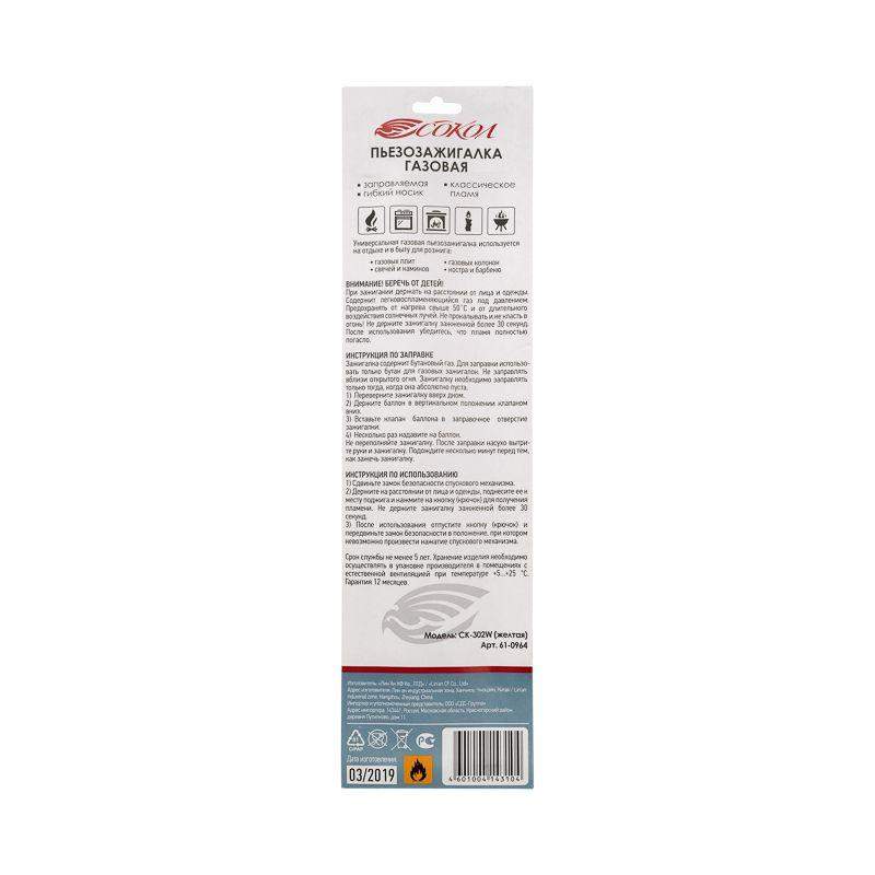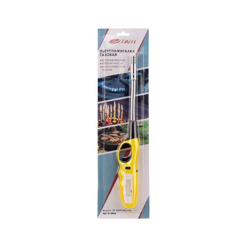 Пьезозажигалка газовая СК-302W бытовая с классическим пламенем многоразовая с гибким стержнем желт. СОКОЛ 61-0964