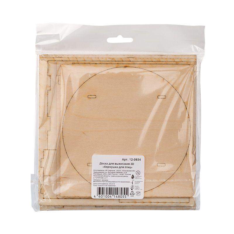 Доски для выжигания 3D — это уникальный продукт 3 в 1: 1. Выжигание по дереву — прекрасное хобби как для ребенка, так и для взрослого. 2. Увлекательная объемная модель для сборки. 3. Уникальная игрушка из натуральных материалов, созданная своими руками. Доски 3D изготовлены из качественной шлифованной фанеры и перфорированны детальками для сборки модели, на которые нанесены рисунки для выжигания с разным уровнем сложности. Для занятий вам понадобится прибор для выжигания, также оформить работу можно акварельными и гуашевыми красками, цветными карандашами и фломастерами. В процессе занятий у детей развивается мелкая моторика пальцев, внимательность, усидчивость и аккуратность. У ребенка формируются навыки рисования и фантазия, основы работы с выжигателем. Доски относятся к эко-игрушкам, обладают всеми сопутствующем достоинствами: - естественный цвет и запах положительно влияют на психику; - фактура, текстура и плотность дерева передают тактильные ощущения и играют важную роль в познании мира, дают ребенку реальные представления о вещах и материалах; - натуральные материалы развивают вкус и эстетические качества. Основные характеристики: Модель: «Кормушка для птиц» Размер готовой поделки: 15х17 см Страна-производитель: Россия *Для занятий вам потребуется прибор для выжигания. Советуем приобрести: Универсальный выжигательный прибор: - артикул 12-0142 - артикул 12-9820 Наборы паяльников-выжигателей с различными насадками: - артикул 12-0183-1 - артикул 12-0187 - артикул 12-0183 - артикул 12-0186