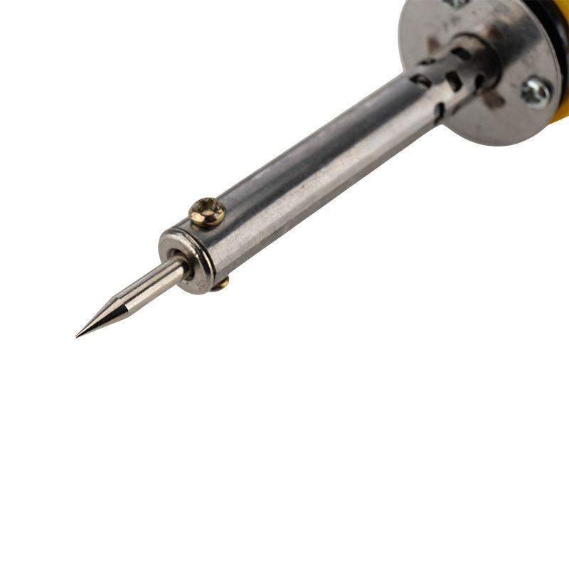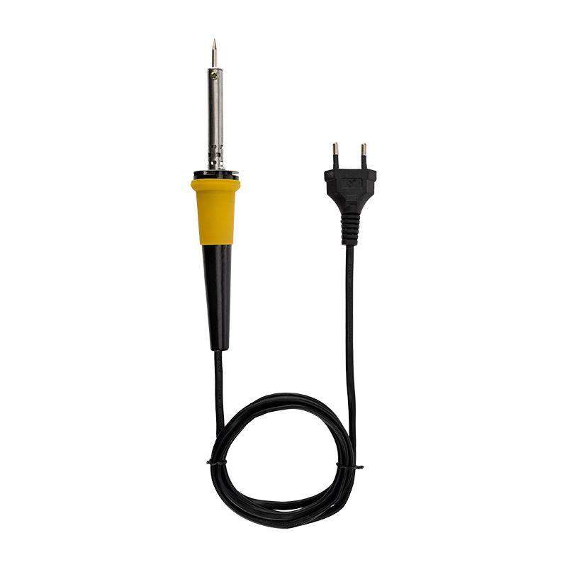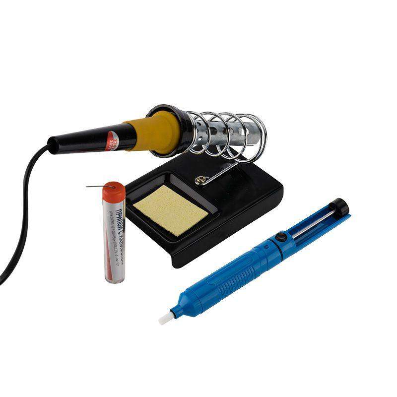Набор для пайки REXANT позволит эффективно, быстро и самостоятельно отремонтировать электротехнику или произвести монтаж оборудования. В набор входит: Паяльник 30 Вт – имеет длинное тонкое жало, которым можно произвести пайку даже в труднодоступных местах. Жало быстро разогревается до нужной температуры. Подставка под паяльник стальная с ложементом под губку для удаления припоя, делает работу с инструментом более удобной, безопасной и продуктивной. Она позволяет уберечь паяльное жало от соприкосновения с другими предметами, в том числе исключая случайные ожоги. Спиралевидный держатель паяльника с хромовым покрытием. Оловоотсос (экстрактор припоя), представляет собой цилиндр с поршнем. Изготовлен из термостойкой пластмассы. Удаляет остатки припоя по завершению работ, не повредив контакты. Припой с канифолью в колбе. Простая конструкция и высококачественное исполнение позволят даже новичку без труда справиться с пайкой различных изделий.
