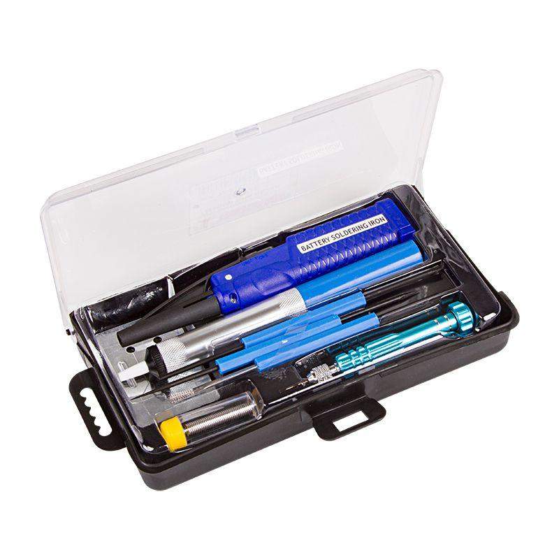 Набор для пайки (паяльник 8 Вт, оловоотсос, подставка, припой, отвертка, инструмент для монтажа) REXANT позволит эффективно, быстро и самостоятельно отремонтировать электротехнику или произвести монтаж оборудования в местах, где отсутствует доступ к электропитанию. В набор входит: 1. Паяльник на батарейках 8 Вт, имеющий длинное тонкое жало для деликатной пайки. Потребляемая мощность: 8 Вт; Напряжение питания: 4.5 В (от батареек АА, 3х1.5 в, не поставляются в комплекте); Температура нагрева жала: 400…450?; Время нагрева жала: не более 15 сек.; Время охлаждения: не более 30 сек.; Кнопка питания имеет защиту от случайного включения; В комплекте защитный колпачок для хранения. 2. Подставка под паяльник из оцинкованного металла. Она позволяет уберечь паяльное жало от соприкосновения с другими предметами, а также предотвратит случайные ожоги. 3. Оловоотсос (экстрактор припоя), представляет собой цилиндр с поршнем. Изготовлен из алюминиевого цилиндра и термостойкой пластмассы. Удаляет остатки припоя по завершению работ, не повредив контакты. 4. Припой с канифолью в колбе. Олово 60% и свинец 40%. 5. Двухсторонний монтажный инструмент, 3 предмета (прижим, вилка, крючок, металлическая кисточка, шило). 6. Отвертка со сменными двухсторонними насадками. Габаритные размеры пластикового бокса 250х140х45 мм Простая конструкция и высококачественное исполнение позволят даже новичку без труда справиться с пайкой различных изделий.