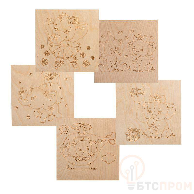 Выжигание по дереву — прекрасное хобби как для ребенка, так и для взрослого. Доски для выжигания по дереву изготовлены из качественной шлифованной фанеры и относятся к эко-игрушкам, обладают всеми сопутствующем достоинствами: - естественный цвет и запах положительно влияют на психику; - фактура, текстура и плотность дерева передают тактильные ощущения и играют важную роль в познании мира, дают ребенку реальные представления о вещах и материалах; - натуральные материалы развивают вкус и эстетические качества. На доски нанесены разные рисунки с разным уровнем сложности. Для занятий вам понадобится прибор для выжигания, также оформить работу можно акварельными и гуашевыми красками, цветными карандашами и фломастерами. У детей развивается мелкая моторика пальцев, внимательность, усидчивость и аккуратность. У ребенка формируются навыки рисования и фантазия, основы работы с выжигателем. Состав набора «Слоненок»: 5 досок для выжигания — сюжеты со слоненком (слоненок на лужайке, слонята на празднике, слоненок на шаре, слоненок с подарком, слоненок летчик). Основные характеристики: Размеры доски: 15х15 см; толщина: 4 мм Страна-производитель: Россия *Для занятий вам потребуется прибор для выжигания. Советуем приобрести: Универсальный выжигательный прибор: - артикул 12-0142 - артикул 12-9820 Наборы паяльников-выжигателей с различными насадками: - артикул 12-0183-1 - артикул 12-0187 - артикул 12-0183 - артикул 12-0186