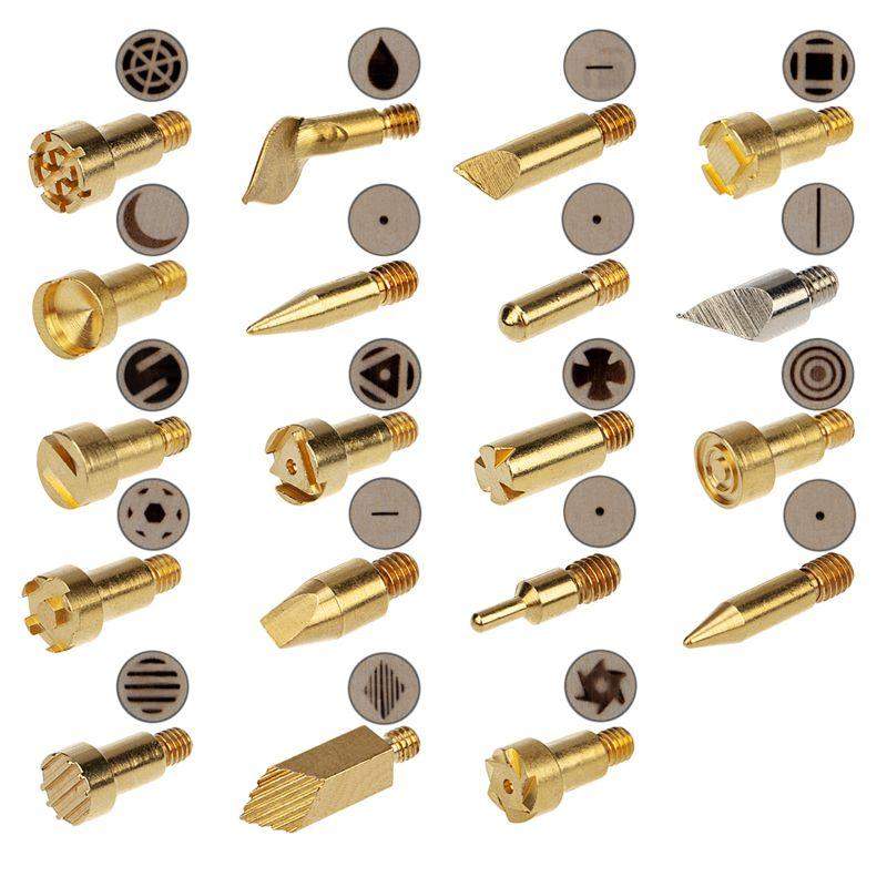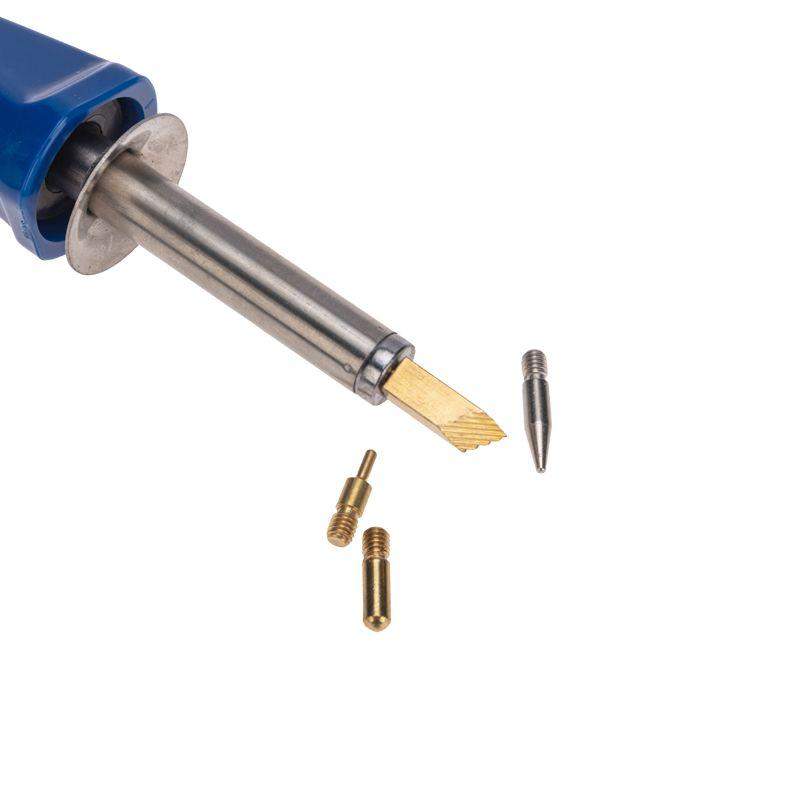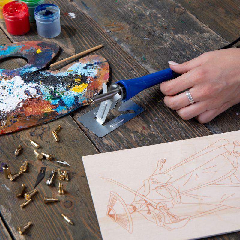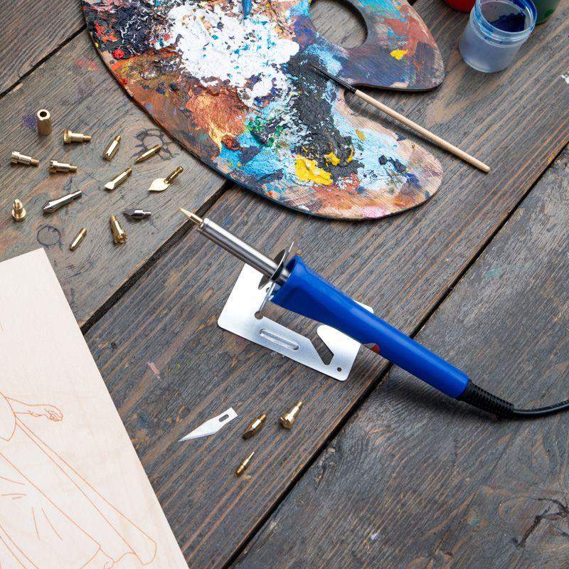 Паяльник-выжигатель с набором насадок REXANT представляет отличное решение для тех, кто стремится по максимуму использовать полезные приборы. Благодаря различным насадкам (21 шт) устройство можно использовать в качестве паяльника, горячего ножа и выжигателя. С помощью этих насадок можно создавать красивые картины, выжигая на дереве различные узоры, выполнять выжигание на изделиях из кожи, резать пластмассу, вырезать на воске или пенопласте и т.п. Все насадки закрепляются с помощью резьбового соединения. В комплект входит: паяльник, жало для пайки, выжигательные насадки 19 шт., насадка-нож с цанговым зажимом, металлическая подставка. Основные характеристики: Напряжение питания, В: 230 Мощность, Вт: 30 Диапазон температур нагрева (?): 400…450 Время разогрева (в минутах): 5-8 Установочный диаметр жала, мм: 4