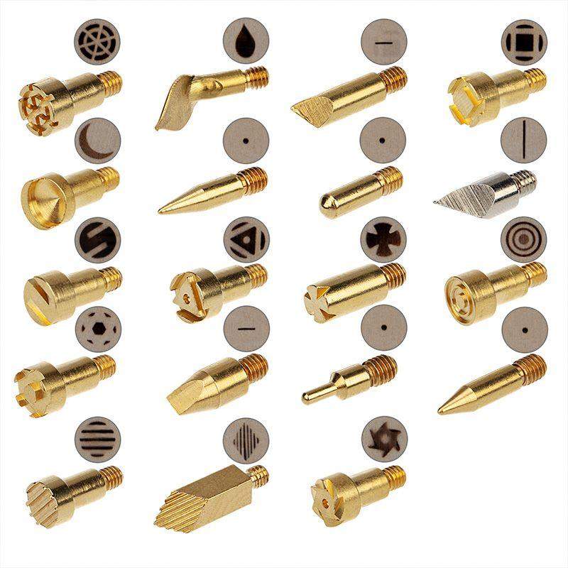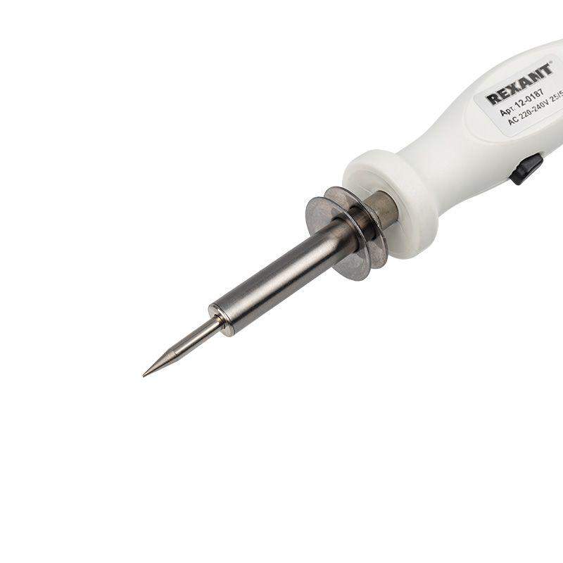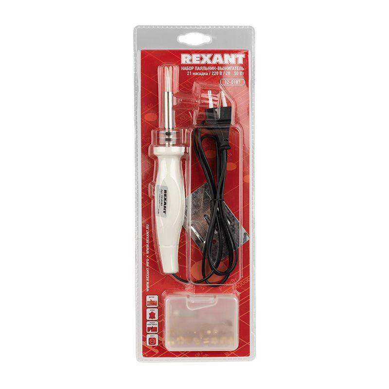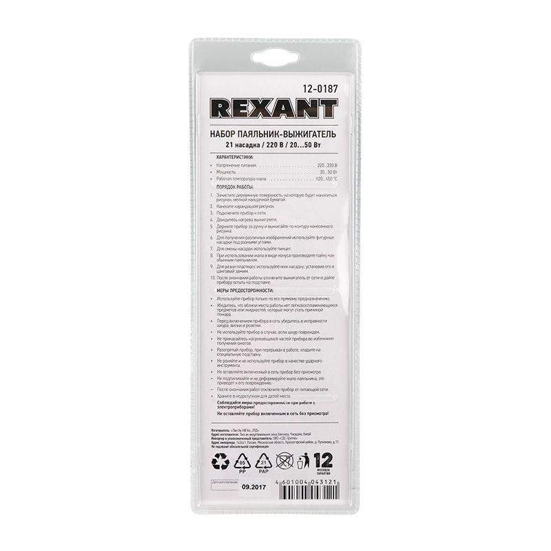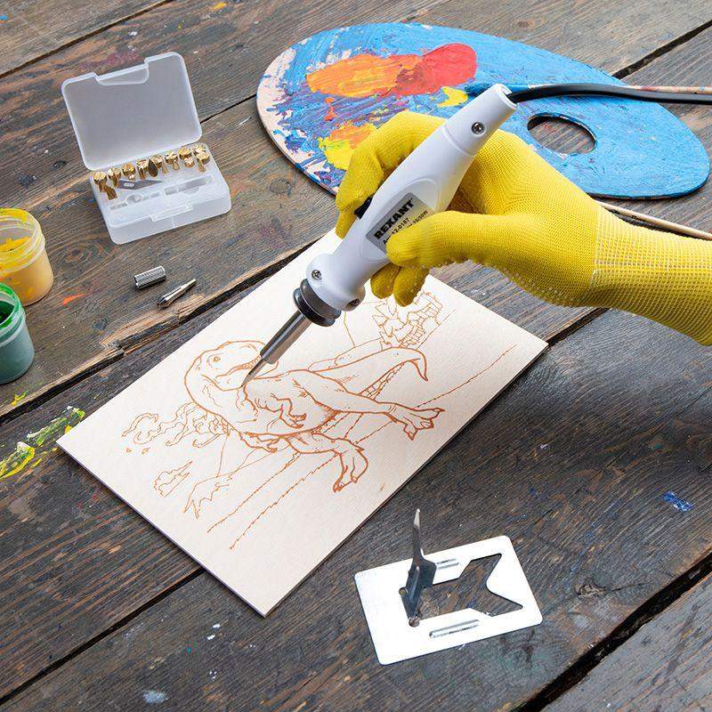 Паяльник-выжигатель с набором насадок REXANT представляет отличное решение для тех, кто стремится по максимуму использовать полезные приборы. Благодаря различным насадкам (21 шт) устройство можно использовать в качестве паяльника, горячего ножа и выжигателя. С помощью этих насадок можно создавать красивые картины, выжигая на дереве различные узоры, выполнять выжигание на изделиях из кожи, резать пластмассу, вырезать на воске или пенопласте и т.п. Все насадки закрепляются с помощью резьбового соединения. В комплект входит: паяльник, жало для пайки, выжигательные насадки 19шт., насадка-нож с цанговым зажимом, металлическая подставка. Данный прибор очень экономичен, потому что имеет два режима нагрева наконечника 20Вт и 50Вт. Паяльник-выжигатель может стать прекрасным творческим подарком как для взрослого, так и для ребенка старше 8 лет. Для достижения наилучшего результата в работе, используйте припой торговой марки REXANT. Технические характеристики: Напряжение питания: 230 В Потребляемая мощность: 20/50 Вт Рабочая температура жала: 420...450 °С Время разогрева до рабочей температуры: 5-8 мин. Установочный диаметр жала, мм: 4 Длина шнура питания: 1,2 м