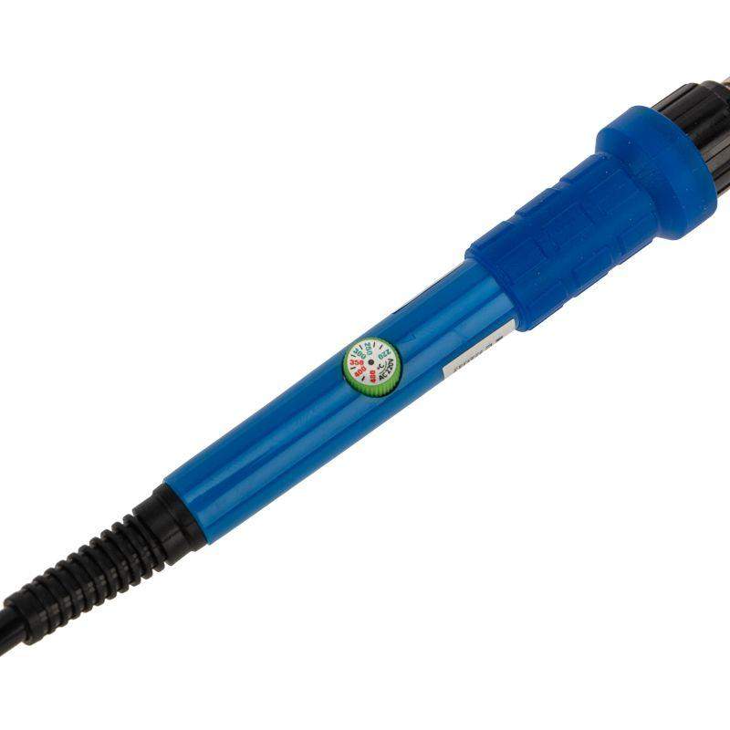 Паяльник с керамическим нагревателем и регулятором температуры REXANT предназначен для ручного монтажа радиоэлементов. Его используют как в домашних условиях, так и в профессиональных мастерских. Паяльник выполнен с керамическим нагревательным элементом и долговечным жалом. В корпус встроен аналоговый регулятор температуры в диапазоне 220...480 °C. Широкий диапазон рабочих температур позволяет применять такой паяльник для самых разных задач. Острое тонкое жало идеально подойдет для точных работ с электронными компонентами. Сочетает в себе современный дизайн и компактный размер. Удобная эргономичная рукоятка выполнена из термостойкого пластика с резиновой накладкой, она сделает работу с инструментом легкой и приятной. В случае необходимости можно легко и быстро заменить жало паяльника. Комплектация: паяльник, подставка, 5 жал разных типов. ТЕХНИЧЕСКИЕ ХАРАКТЕРИСТИКИ Напряжение питания: 220-230 В 50 Гц Потребляемая мощность: 60 Вт Диапазон рабочих температур жала: 220...480 °C Тип управления температурой: аналоговый Цифровой дисплей: нет Тип нагревателя паяльника: керамический Габаритные размеры: 18х2.5х2.5 см Длина провода: 1.3 м