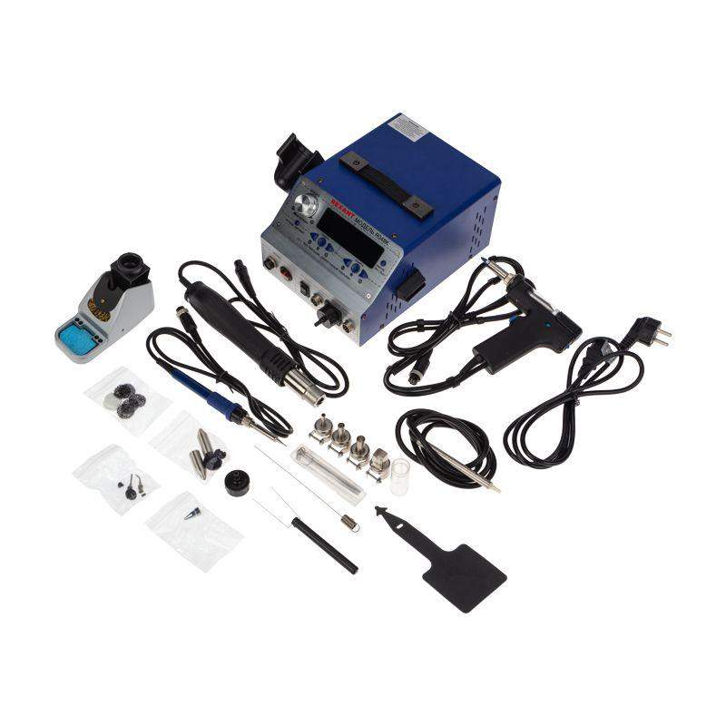 Многофункциональная паяльная станция 3 в 1 предназначена для демонтажа или пайки различных видов электронных компонентов. В основном используется для ремонта портативной электроники, бытовой техники, а также для сборочных операций в небольшом производстве. Станция оснащена классическим паяльником, термофеном и демонтажным паяльником. Все рабочие инструменты станции автономны и могут работать независимо друг от друга. Микрокомпьютер для цифрового отображения данных и контроля температуры с точностью до 1 °C, большая мощность, быстрый разогрев. Все эти преимущества делают бессвинцовую распайку или пайку безопасной для таких чувствительных компонентов как SOIC, PLCC, QFP, BGA и т. д. В комплектацию станции входят: основной блок, удобный контроль управления, паяльник, демонтажный паяльник, держатели паяльников и фена, губка для очистки жала (в ложементе).