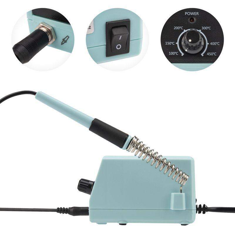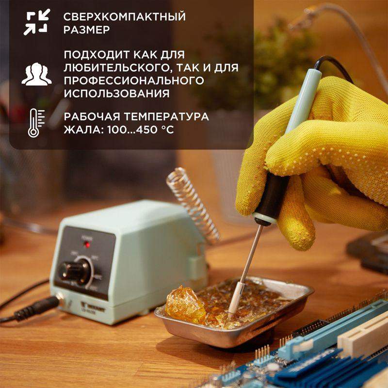 Паяльная станция МИНИ 230В/10Вт REXANT с контролем температуры предназначена для ручного монтажа радиоэлементов. Подходит как для любительских, так и для профессиональных паяльных работ. Сочетает в себе современный дизайн и сверхкомпактный размер, что позволяет экономить рабочее пространство. Температура нагрева жала варьируется в диапазоне от 100 до 450 °С и регулируется с помощью механического потенциометра. Станция комплектуется миниатюрным низковольтным (12 В) паяльником и спиральным держателем паяльника.