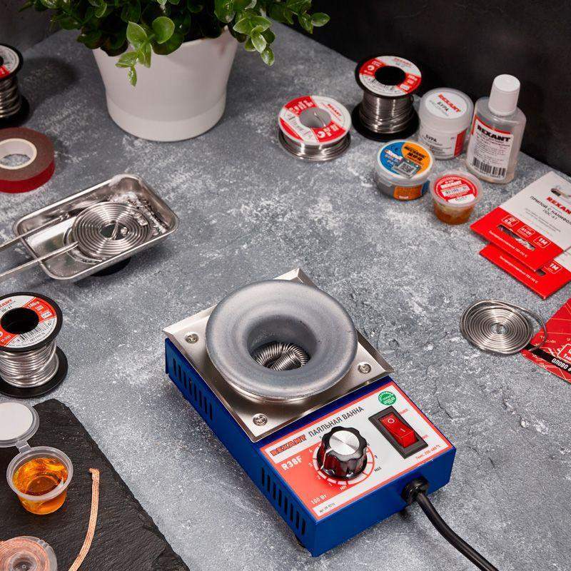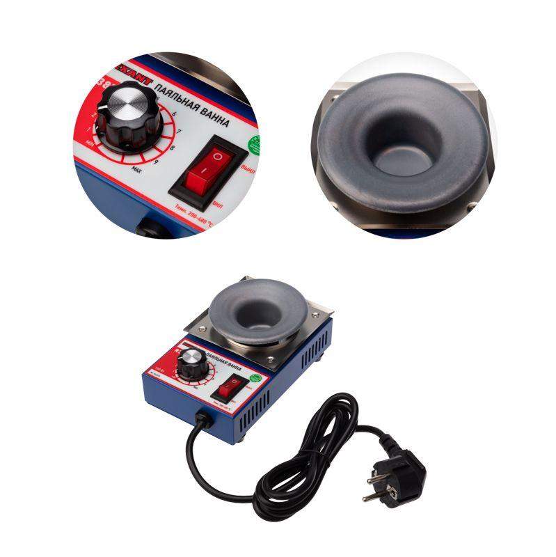Паяльная ванна применяется для лужения проводников, кабельных наконечников в расплавленном припое. Общее описание: - Паяльная ванна поддерживает бессвинцовую технологию. - Улучшенное управление температурой, при котором температурный сигнал отсылается на микропроцессор. После обработки сигнал регулирует степень нагрева нагревательного элемента для точности температурного контроля. Обеспечивает нагрев в температурном диапазоне от 200...480 °С, нужная температура достигается за короткое время. Технические характеристики: Напряжение питания: 230 В/50 Гц Мощность: 100 Вт Рабочая температура: 200-480 °С Тип припоя: бессвинцовый Вместимость припоя: 300 г Время плавления: 30 мин Диаметр ванны: 38 мм Комплектация: Основной блок: 1 шт. Инструкция по эксплуатации (паспорт): 1 шт. Правила безопасности: Для предотвращения несчастных случаев и повреждения паяльной станции соблюдайте требования безопасности: 1. Хранить в недоступном для детей месте. 2. Ванна должна быть установлена на ровной устойчивой поверхности, исключающей наклон, опрокидывание и ее падение. 3. Не располагайте ванну в местах, где расстояние до предметов и конструкций сверху менее 1 метра. 4. Для обеспечения безопасности проверьте закрепление провода заземления. 5. В процессе работы не оставляйте ванну разогретой до высоких температур долгое время, т. к. это может отрицательно повлиять на качество припоя и сократить срок службы паяльной ванны. 6. Рабочие части устройства имеют высокую температуру. Не допускайте контакта частей тела с нагретыми частями ванны для предотвращения ожогов. 7. Не допускайте контакта ванны с посторонними предметами. 8. Не включайте устройство без наличия припоя в ванне. 9. Недопустимо использование низкокипящих флюсов при использовании паяльной ванны. Это может привести к разбрызгиванию горячего флюса и припоя из ванны. 10. Если нагрева не происходит, то убедитесь в исправности установленного предохранителя. 11. Не используйте паяльную ванну при высокой температуре в течение длительного времени, т. к. это может стать причиной износа паяльной ванны и даже несчастного случая. 12. Не допускайте детей к монтажу и эксплуатации устройства. 13. Не погружайте изделие в воду. 14. В целях безопасной работы паяльной ванны, а также для продления срока ее службы не рекомендуется, чтобы единовременный рабочий период превышал 8 часов. 15. При работе с паяльными ваннами соблюдайте меры пожарной безопасности и требования по работе с электроприборами. 16. Не пользуйтесь изделием, если оно повреждено или имеет признаки неисправности. 17. Не пытайтесь разбирать, диагностировать или ремонтировать изделие самостоятельно. Ремонт и обслуживание должны осуществлять только квалифицированные специалисты! Порядок работы: 1. Установите паяльную ванну на устойчивую ровную поверхность. 2. Положите в паяльную ванну припой, исключая выступание частей припоя за края паяльной ванны. 3. Подключите паяльную ванну к электросети. 4. Включите паяльную ванну. Регулятором выставьте нужную температуру. 5. При расплавлении припоя в ванне приступите к лужению, кратковременно опуская в расплавленный припой предназначенные для лужения части. 6. По окончании работы отключите ванну. Дождитесь ее полного остывания.