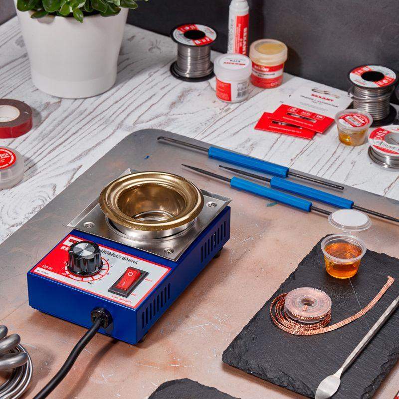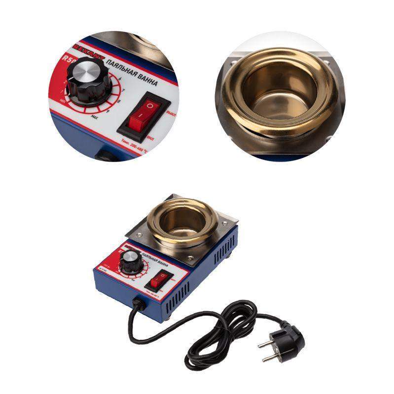 Паяльная ванна применяется для лужения проводников, кабельных наконечников в расплавленном припое. Общее описание: Улучшенное управление температурой, при котором температурный сигнал отсылается на микропроцессор. После обработки сигнал регулирует степень нагрева нагревательного элемента для точности температурного контроля. Обеспечивает нагрев в температурном диапазоне от 200...480 °С, нужная температура достигается за короткое время. Технические характеристики: Напряжение питания: 230 В/50 Гц Мощность: 150 Вт Рабочая температура: 200-480 °С Вместимость припоя: 500 г Время плавления: 30 мин Диаметр ванны: 50 мм Комплектация: Основной блок: 1 шт. Инструкция по эксплуатации (паспорт): 1 шт. Правила безопасности: Для предотвращения несчастных случаев и повреждения паяльной станции соблюдайте требования безопасности: 1. Хранить в недоступном для детей месте. 2. Ванна должна быть установлена на ровной устойчивой поверхности, исключающей наклон, опрокидывание и ее падение. 3. Не располагайте ванну в местах, где расстояние до предметов и конструкций сверху менее 1 метра. 4. Для обеспечения безопасности проверьте закрепление провода заземления. 5. В процессе работы не оставляйте ванну разогретой до высоких температур долгое время, т. к. это может отрицательно повлиять на качество припоя и сократить срок службы паяльной ванны. 6. Рабочие части устройства имеют высокую температуру. Не допускайте контакта частей тела с нагретыми частями ванны для предотвращения ожогов. 7. Не допускайте контакта ванны с посторонними предметами. 8. Не включайте устройство без наличия припоя в ванне. 9. Недопустимо использование низкокипящих флюсов при использовании паяльной ванны. Это может привести к разбрызгиванию горячего флюса и припоя из ванны. 10. Если нагрева не происходит, то убедитесь в исправности установленного предохранителя. 11. Не используйте паяльную ванну при высокой температуре в течение длительного времени, т.к. это может стать причиной износа паяльной ванны и даже несчастного случая. 12. Не допускайте детей к монтажу и эксплуатации устройства. 13. Не погружайте изделие в воду. 14. В целях безопасной работы паяльной ванны, а также для продления срока ее службы не рекомендуется, чтобы единовременный рабочий период превышал 8 часов. 15. При работе с паяльными ваннами соблюдайте меры пожарной безопасности и требования по работе с электроприборами. 16. Не пользуйтесь изделием, если оно повреждено или имеет признаки неисправности. 17. Не пытайтесь разбирать, диагностировать или ремонтировать изделие самостоятельно. Ремонт и обслуживание должны осуществлять только квалифицированные специалисты! Порядок работы: 1. Установите паяльную ванну на устойчивую ровную поверхность. 2. Положите в паяльную ванну припой, исключая выступание частей припоя за края паяльной ванны. 3. Подключите паяльную ванну к электросети. 4. Включите паяльную ванну. Регулятором выставьте нужную температуру. 5. При расплавлении припоя в ванне приступите к лужению, кратковременно опуская в расплавленный припой предназначенные для лужения части. 6. По окончании работы отключите ванну. Дождитесь ее полного остывания.