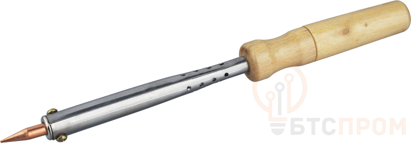 Эргономичная деревянная рукоятка удобно лежит в руке, предотвращая скольжение и перегрев, что снижает усталость оператора при длительной работе. Прямое коническое медное жало типа «конус» позволяет выполнять тонкие и точные работы. Комплектация включает подставку для безопасного размещения разогретого инструмента. Напряжение питания: 220 В.