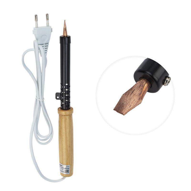Паяльник с деревянной ручкой серии ЭПСН мощностью 100 Вт REXANT предназначен для ручного монтажа/демонтажа деталей среднего и крупного размера, а также для лужения. Подходит как для любительского, так и для профессионального использования. Медное жало выполнено в форме клина (лопатки), в случае необходимости его можно легко и быстро заменить (сменное жало в комплект не входит). Удобная эргономичная рукоятка выполнена из экологически чистого материала - дерева, она сделает работу с инструментом легкой и приятной.
