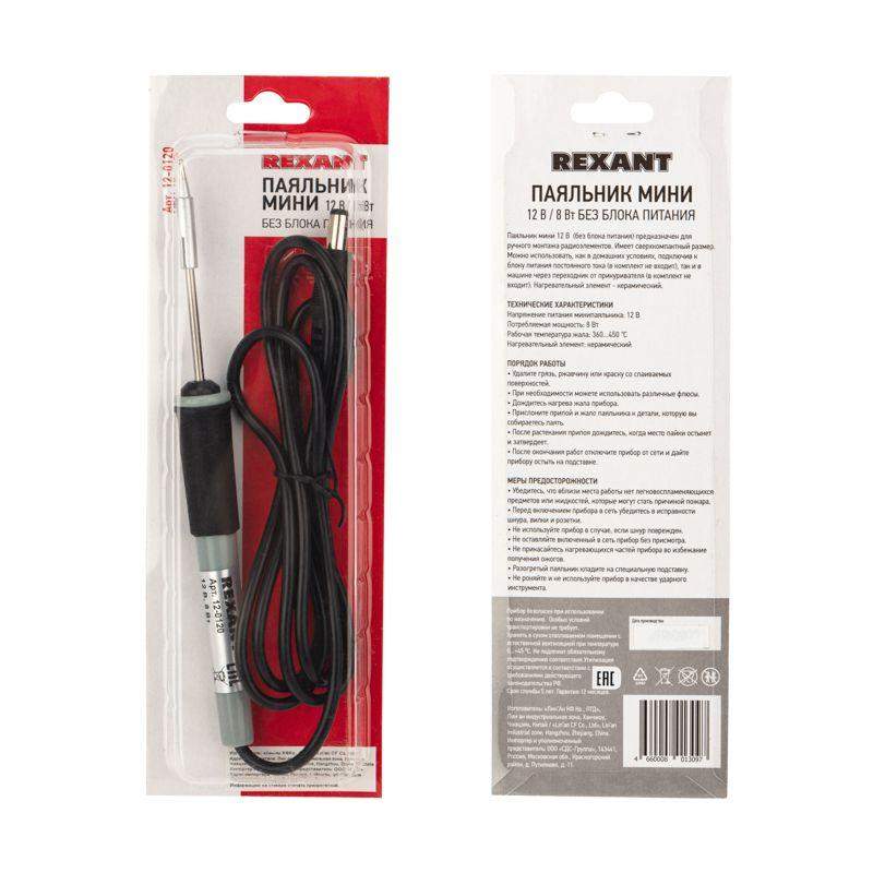 Паяльник с керамическим нагревателем серии МИНИ мощностью 8Вт REXANT предназначен для ручного монтажа радиоэлементов и других мелких деталей. Имеет сверхкомпактный размер. Можно использовать как в домашних условиях, подключив штекер 5,5мм к блоку питания постоянного тока (в комплект не входит), так и в автомобиле с бортовым напряжением 12В через переходник (в комплект не входит) от гнезда прикуривателя. Керамический нагреватель обеспечит быстрый прогрев жала и длительный срок службы паяльника.