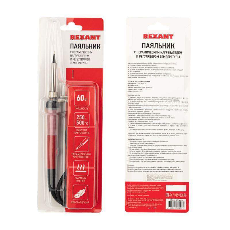 Паяльник с регулировкой температуры серии Japan type мощностью 60Вт REXANT предназначен для ручного монтажа/демонтажа электронных компонентов и других мелких и средних деталей. Подходит как для любительского, так и для профессионального использования. Функционал прибора позволяет с помощью регулятора менять рабочую температуру жала в диапазоне 250...500°C. Долговечное жало паяльника состоит из медьсодержащего сердечника, покрытого слоем электролитически осажденного железа, отличающегося высокой стойкостью к коррозии. В комплекте есть запасное коническое жало, поэтому в случае необходимости жало на паяльнике можно легко и быстро заменить. Керамический нагреватель обеспечит быстрый прогрев жала и длительный срок службы паяльника. Прибор оснащен ударопрочной рукояткой из термостойкого пластика с резиновой накладкой, которая сделает работу с инструментом легкой и приятной. Данная модель сочетает в себе современный дизайн и ультралегкий вес.