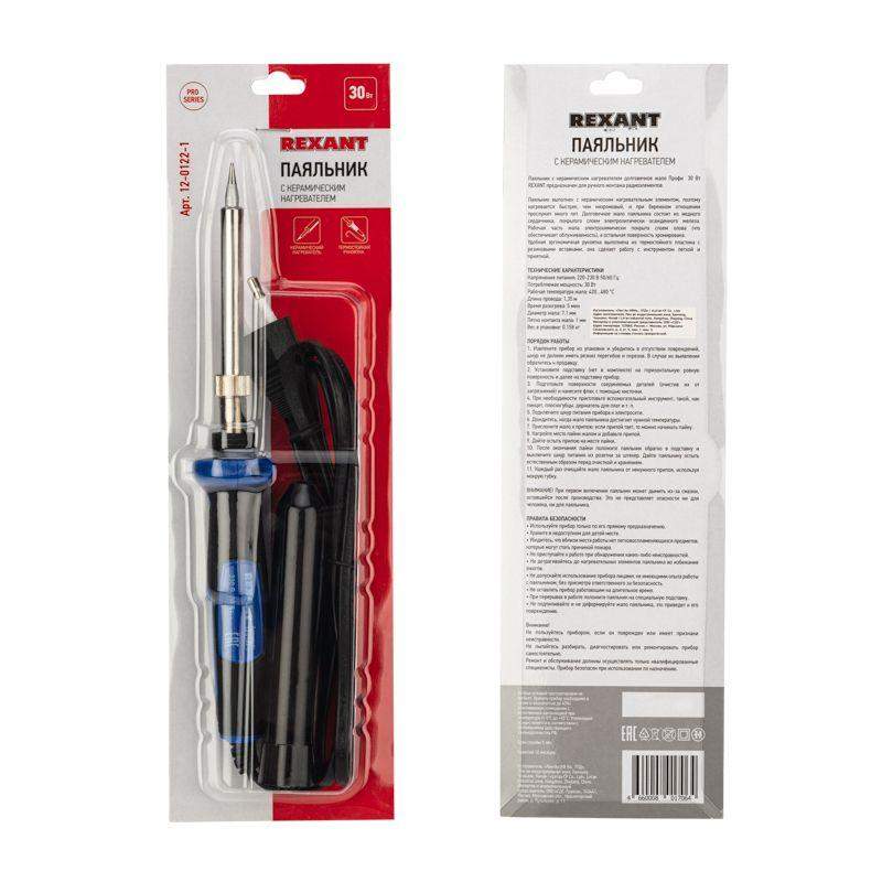 Паяльник с керамическим нагревателем серии Comfort мощностью 30Вт REXANT предназначен для ручного монтажа/демонтажа электронных компонентов и других мелких деталей. Подходит как для любительского, так и для профессионального использования. Долговечное жало паяльника состоит из медьсодержащего сердечника, покрытого слоем электролитически осажденного железа, отличающегося высокой стойкостью к коррозии. При соблюдении ряда предосторожностей жало способно работать длительное время без утраты эксплуатационных свойств, а в случае необходимости его можно легко и быстро заменить (сменное жало в комплект не входит). Керамический нагреватель обеспечит быстрый прогрев жала и длительный срок службы паяльника. Карболитовый колпачок, поставляемый в комплекте, защитит жало и корпус паяльника от повреждений во время транспортировки или хранения. Удобная эргономичная рукоятка выполнена из термостойкого пластика с резиновыми вставками, что сделает работу с инструментом легкой и приятной.