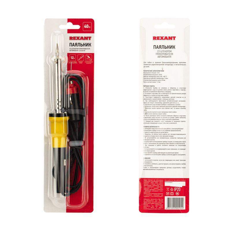Паяльник со штекером прикуривателя мощностью 40Вт REXANT предназначен для ручного монтажа/демонтажа мелких и средних деталей. Подключается в разъем прикуривателя автомобиля с рабочим напряжением бортовой цепи 12В, что делает процесс пайки более безопасным. Долговечное жало паяльника состоит из медьсодержащего сердечника, покрытого слоем хрома. Паяльник оснащен эргономичной термостойкой рукояткой с резиновым протектором, что сделает работу с инструментом легкой и приятной.