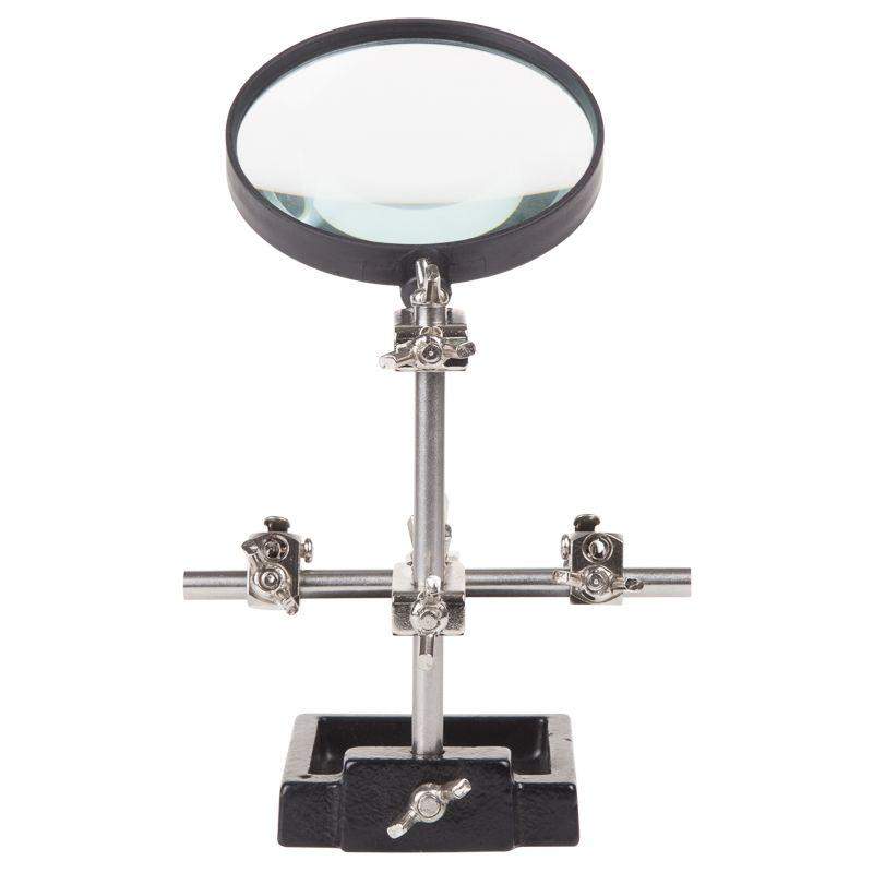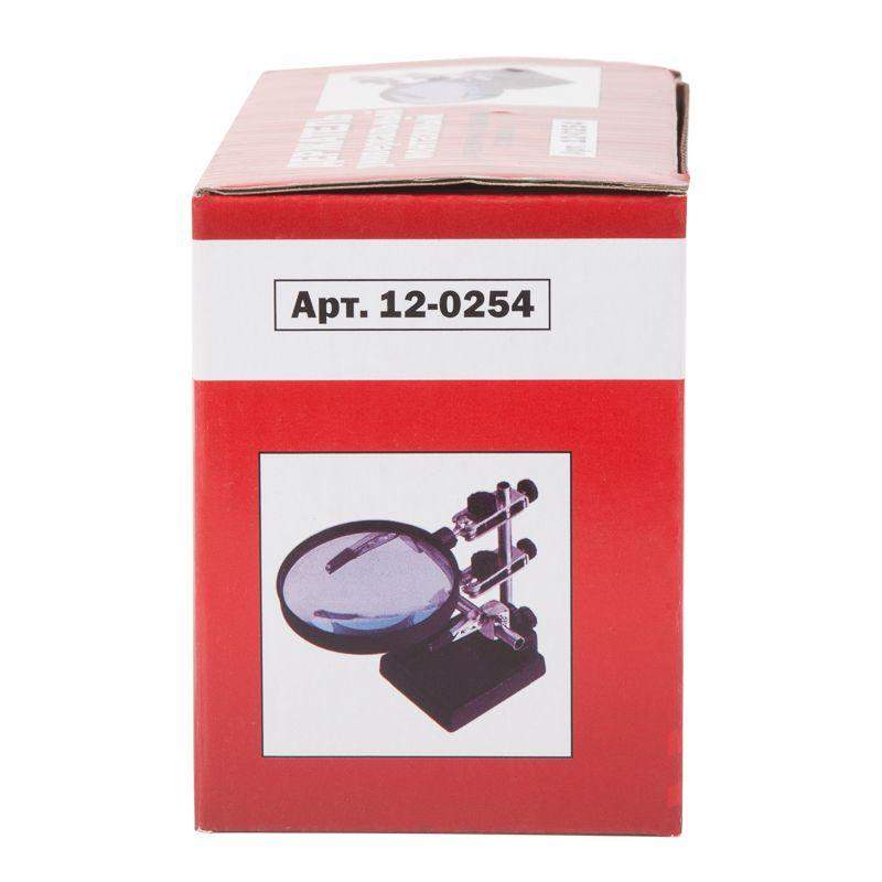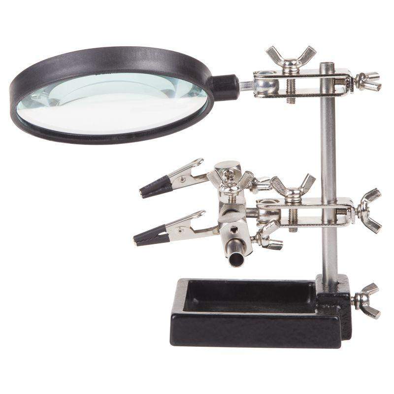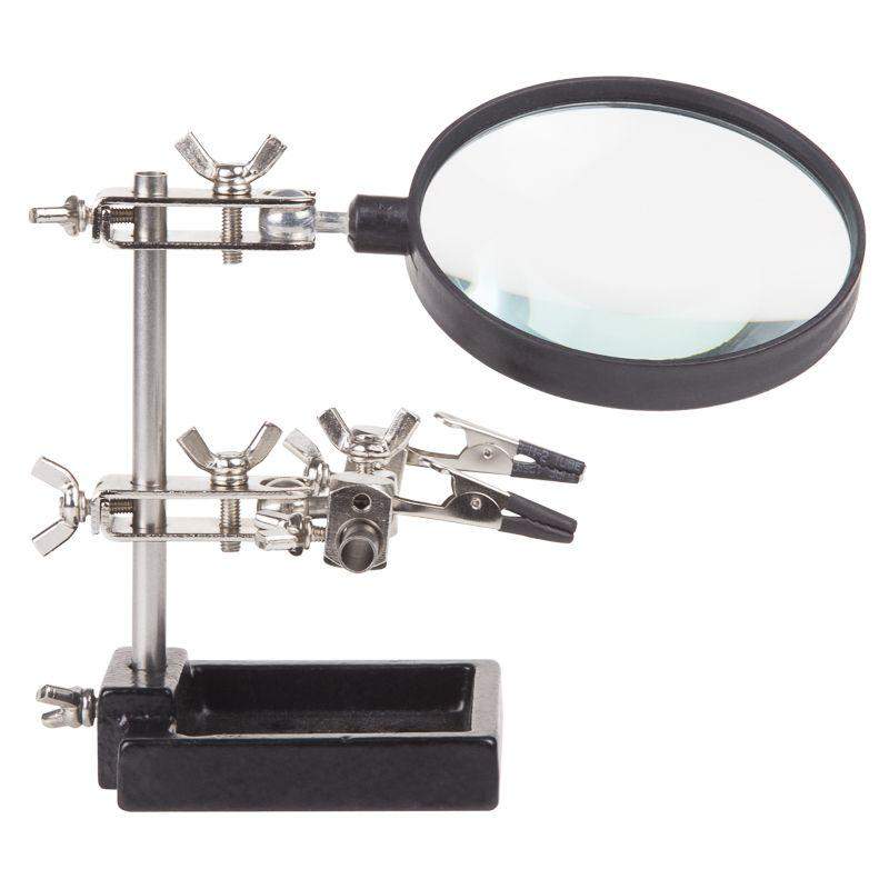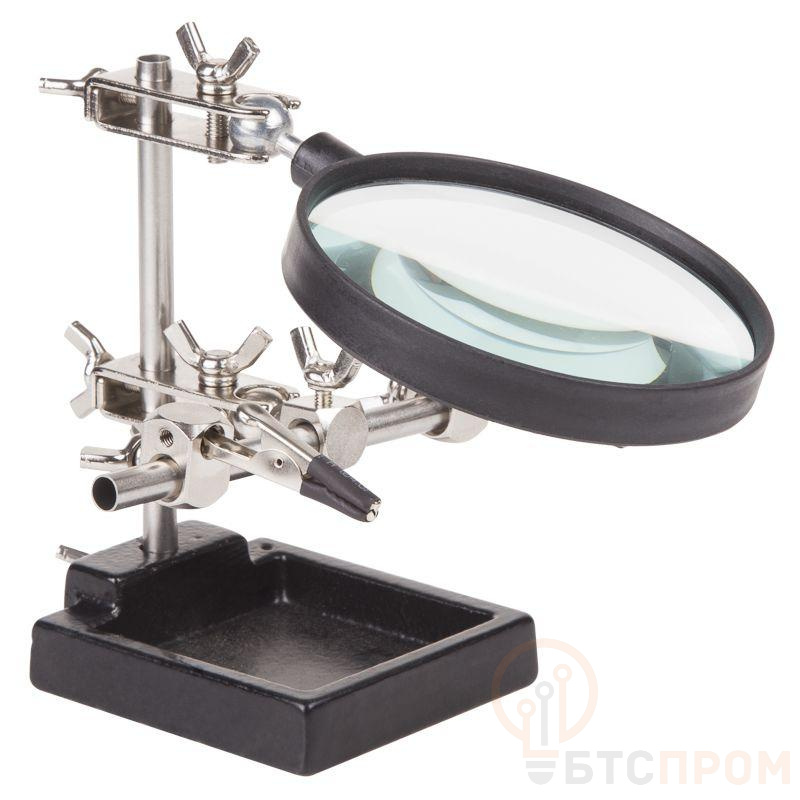 Держатель «третья рука» с лупой х3 REXANT служит главным образом при проведении паяльно-сборочных работ в электронике, ювелирном деле, сборке и ремонте для зажима мелких деталей в любом нужном положении, когда не хватает двух рук. Инструмент состоит из чугунного основания (тяжелая подставка с нишей для мелких деталей или припоя), двух подвижных зажимов типа «крокодил» с никелевым покрытием и лупы с 3-кратным увеличением (возможность регулировки положения, диаметр линзы 90 мм). С помощью лупы можно будет рассмотреть даже самые мелкие детали.