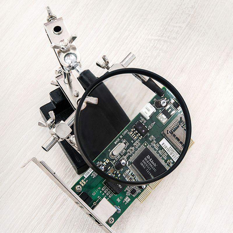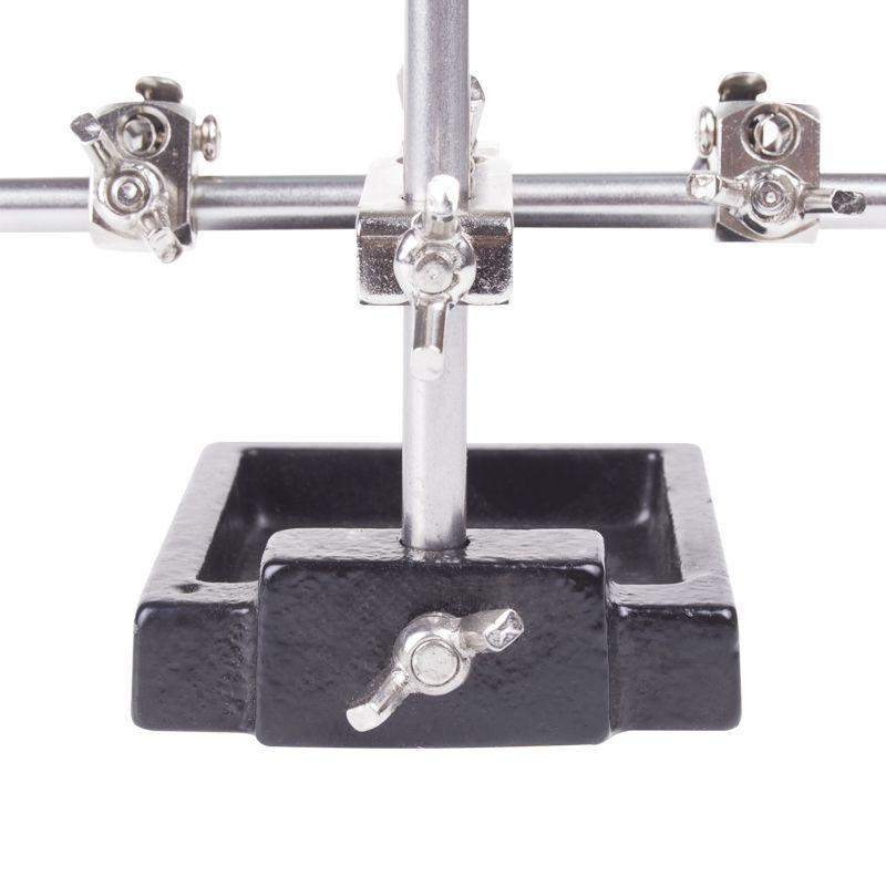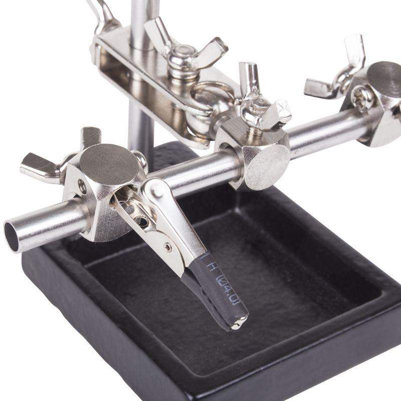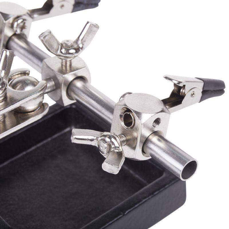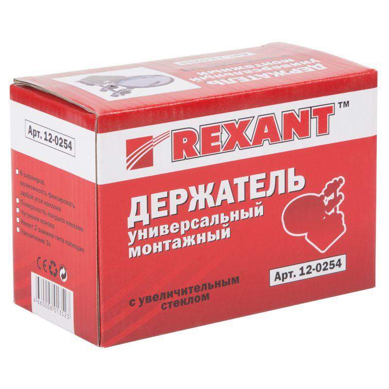 Держатель «третья рука» с лупой х3 REXANT служит главным образом при проведении паяльно-сборочных работ в электронике, ювелирном деле, сборке и ремонте для зажима мелких деталей в любом нужном положении, когда не хватает двух рук. Инструмент состоит из чугунного основания (тяжелая подставка с нишей для мелких деталей или припоя), двух подвижных зажимов типа «крокодил» с никелевым покрытием и лупы с 3-кратным увеличением (возможность регулировки положения, диаметр линзы 90 мм). С помощью лупы можно будет рассмотреть даже самые мелкие детали.