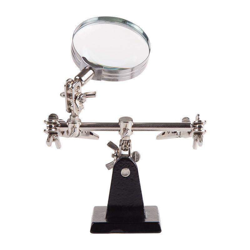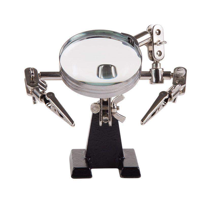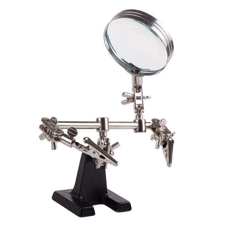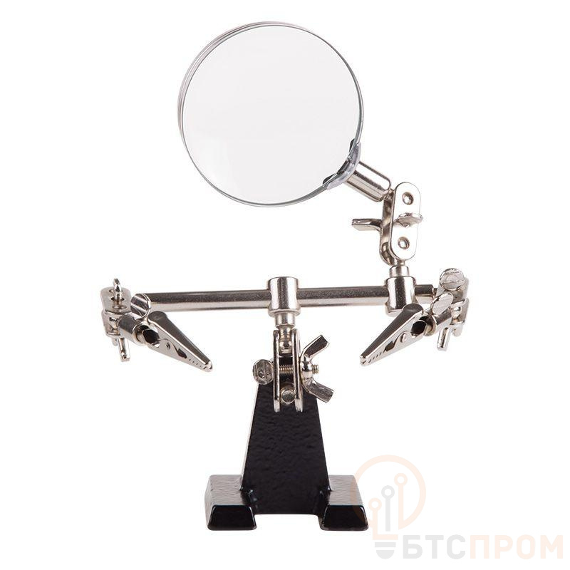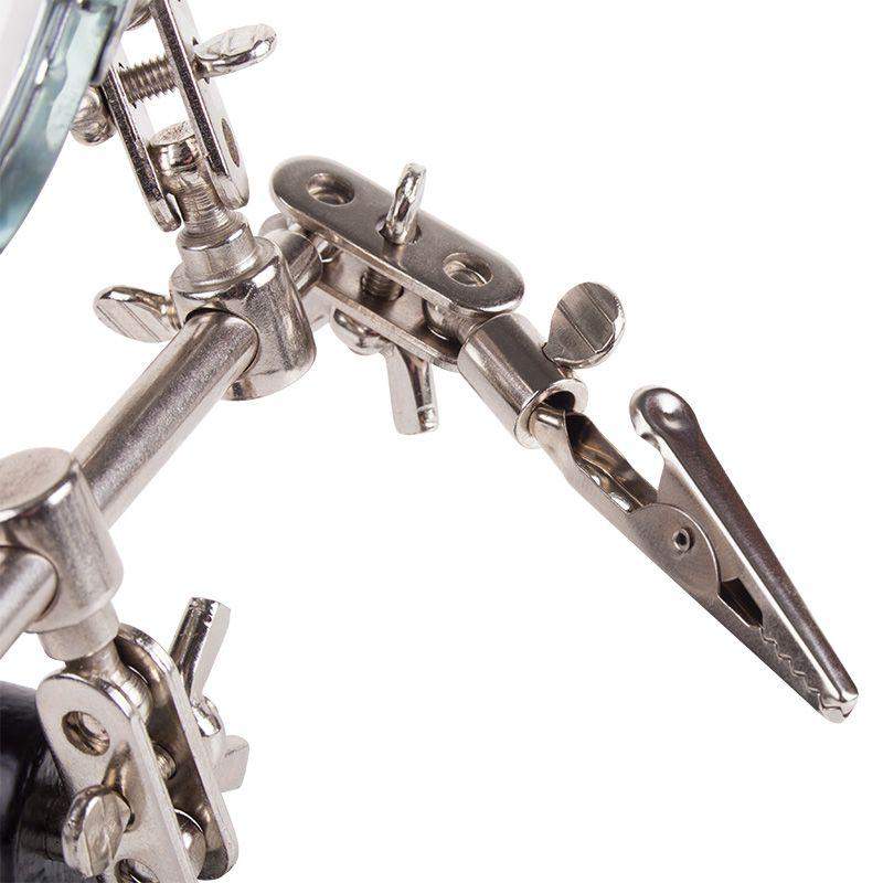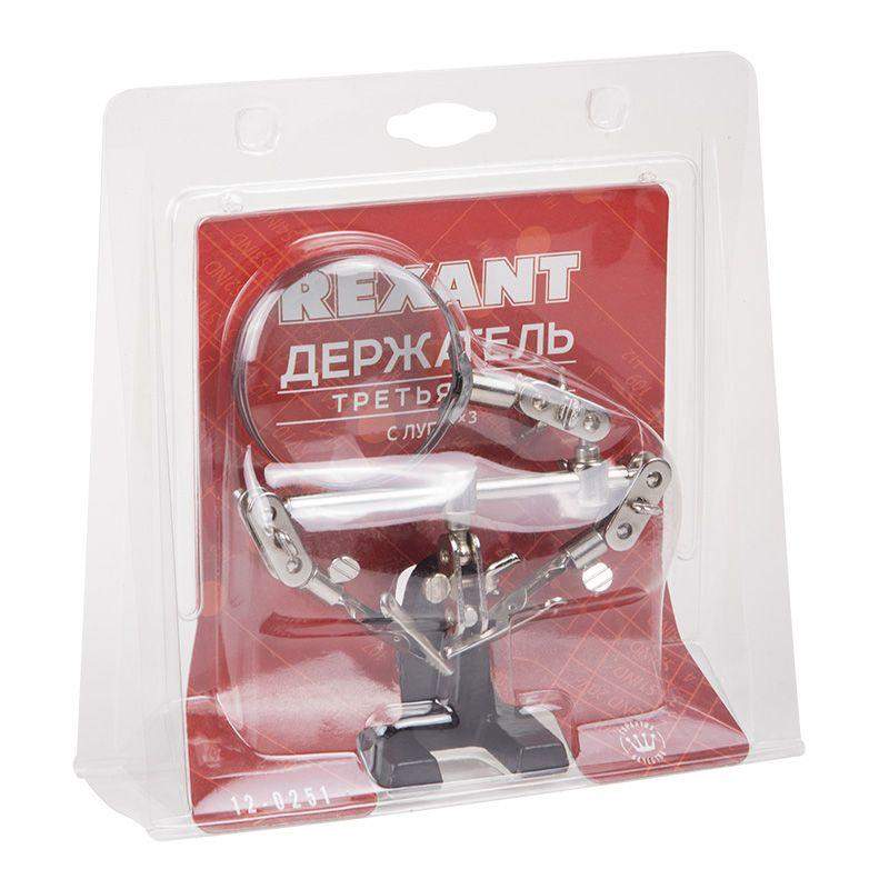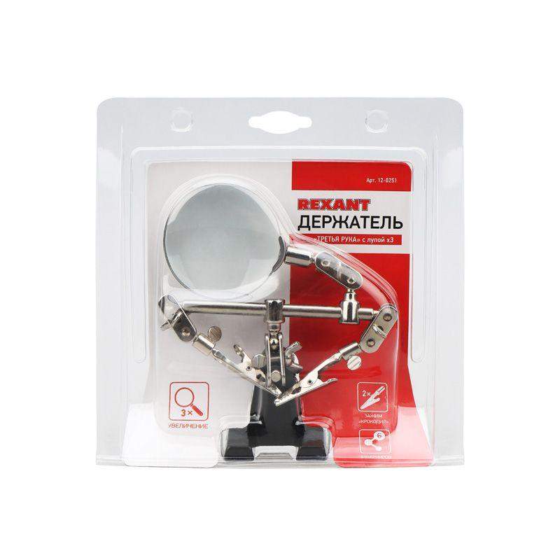 Держатель «третья рука» с лупой х3 REXANT служит, главным образом, при проведении паяльно-сборочных работ в электронике, ювелирном деле, сборке и ремонте для зажима мелких деталей в любом нужном положении, когда не хватает двух рук. Инструмент состоит из чугунного основания (тяжелая подставка), шарнирного соединения с зажимами типа «крокодил» (подвижных во всех плоскостях) с никелевым покрытием и лупы с 3-кратным увеличением (возможность регулировки положения, диаметр линзы 60 мм). С помощью лупы можно будет рассмотреть даже самые мелкие детали. Размер в упаковке:193 x 190 x 64 mm, Размер товара без упаковки в раскрытом виде: 268 x 200 x 55 mm