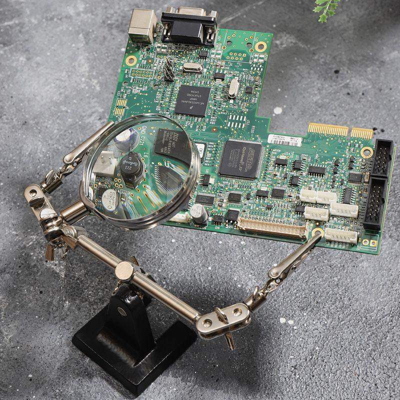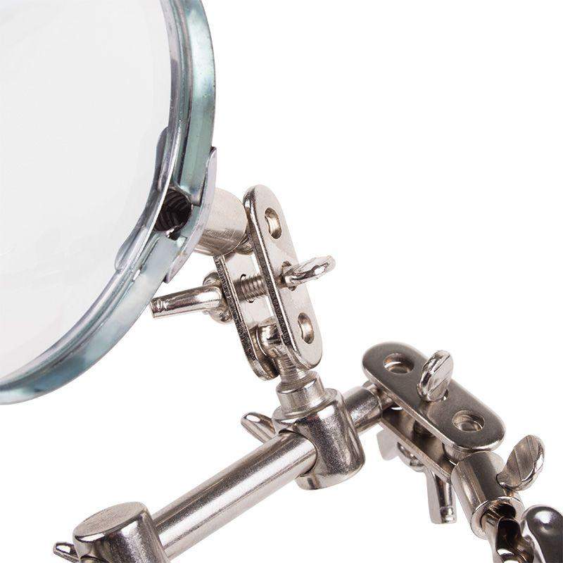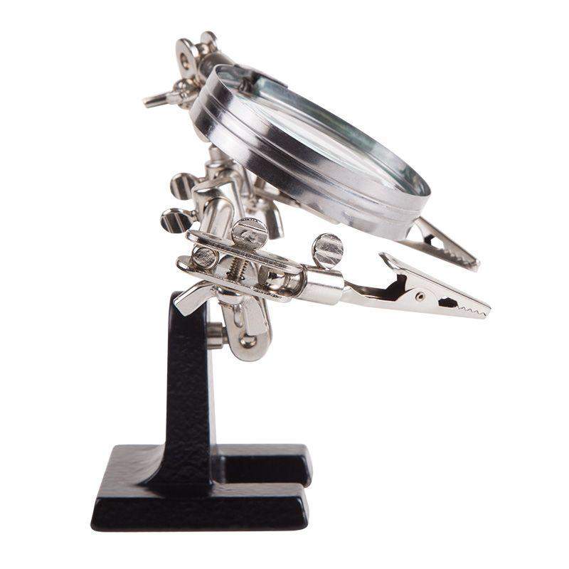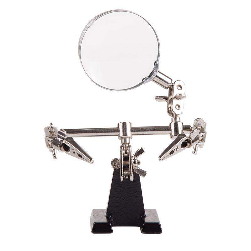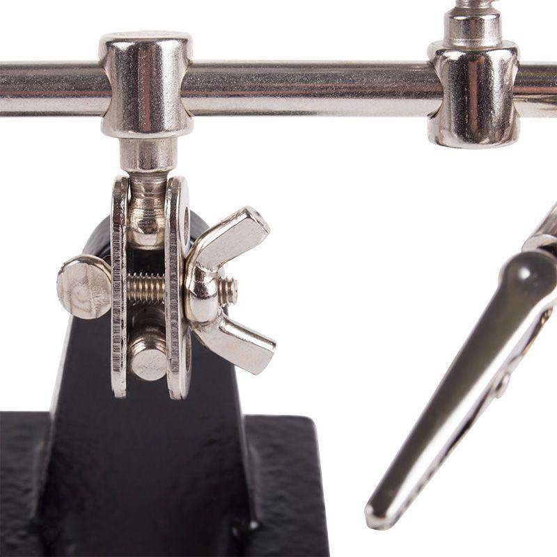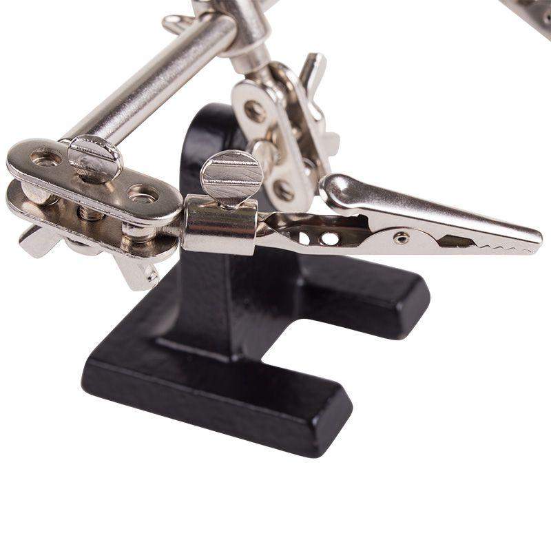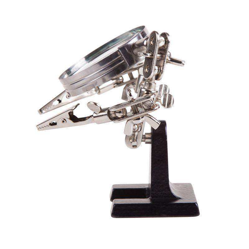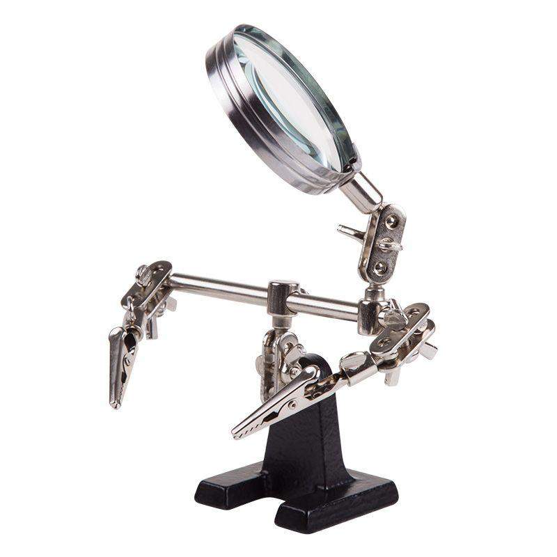 Держатель «третья рука» с лупой х3 REXANT служит, главным образом, при проведении паяльно-сборочных работ в электронике, ювелирном деле, сборке и ремонте для зажима мелких деталей в любом нужном положении, когда не хватает двух рук. Инструмент состоит из чугунного основания (тяжелая подставка), шарнирного соединения с зажимами типа «крокодил» (подвижных во всех плоскостях) с никелевым покрытием и лупы с 3-кратным увеличением (возможность регулировки положения, диаметр линзы 60 мм). С помощью лупы можно будет рассмотреть даже самые мелкие детали. Размер в упаковке:193 x 190 x 64 mm, Размер товара без упаковки в раскрытом виде: 268 x 200 x 55 mm