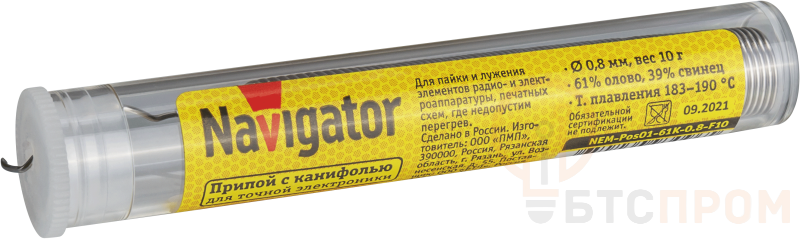 Припой 93 096 NEM-Pos01-61K-0.8-F10 (ПОС-61; колба; 0.8мм; 10 г) Navigator 93096 фото в каталоге от BTSprom.by